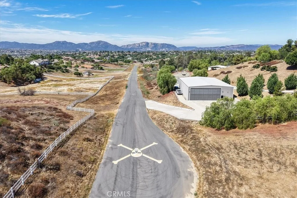 Fly-in convenience meets wine-country luxury with private airstrip* access and a 4,800 sq ft hangar. Perched on 7.36 acres of Temecula wine country, this single-story home offers convenience alongside luxurious living. Step inside through a gated entry to a grand foyer with soaring ceilings that opens to a great room featuring a floor-to-ceiling stone fireplace and vaulted wood-beam ceilings. The chefs kitchen boasts granite countertops, a center island, separate breakfast bar and top-of-the-line stainless steel appliances. Panoramic orchard and mountain views frame the formal dining area. Retreat to the master suite with vaulted ceilings, a private fireplace and dual French doors leading to the landscaped backyard oasis. Enjoy a sparkling pool and spa, dual-sink vanity, jetted jacuzzi tub, large walk-in shower and his-and-hers closets. Three additional bedrooms include two en-suite baths and one versatile room currently used as a home office with its own private entrance. Beyond the home, aviation enthusiasts will love the covered storage adjacent to the hangar and the large, flat event area perfect for RVs, car shows or gatherings. A full-size lighted pickleball court and ample covered storage complete the outdoor amenities. With dramatic 360-degree views, privacy and unparalleled access to a private runway, this rare Temecula property may never be matched. Schedule your private showing today and experience a lifestyle that combines luxury, recreation and aviation. You will NOT see a listing like this again *Airstrip/Runway is private to the Homeowner's Association. *Sell