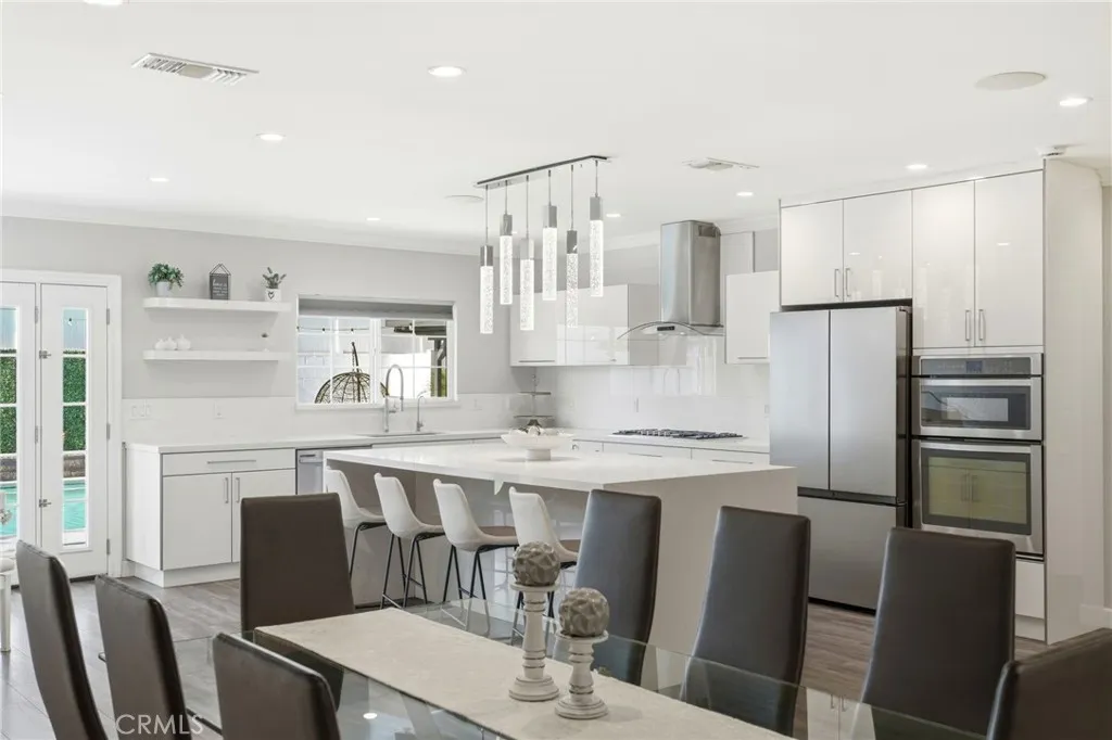 Step inside this beautifully updated home where thoughtful design, modern comforts, and inviting indoor outdoor spaces complete with a private pool come together for effortless everyday living and entertaining. Dark toned wood inspired flooring extends throughout, complemented by fresh interior paint, recessed lighting, and a bright, welcoming atmosphere. The main house offers 3 beds and 2 baths across approx 1,908 sq ft of well designed living space. The kitchen flows seamlessly into the dining and living areas and features clean lined cabinetry, quartz countertops, stainless steel appliances, and a large center island ideal for gathering, casual dining, and hosting family and friends. The living room is anchored by a gas burning fireplace with a contemporary stone surround, while the dining area opens directly to the backyard and pool, creating a seamless indoor outdoor lifestyle. The primary suite is airy and relaxing, featuring recessed lighting, a ceiling fan, and French doors with direct access to the backyard and pool. The en suite bathroom includes a glass enclosed walk in shower with modern tile finishes and a sleek vanity. A secondary hallway bathroom also features a glass enclosed walk in shower with contemporary tilework, creating a cohesive and updated feel throughout the home. Adding exceptional flexibility is the attached ADU built in 2022 as a garage conversion offering approx 448 sq ft with a separate address. The ADU is bright and open equipped with a mini split HVAC system and a tankless water heater making it ideal for guests extended family a private of