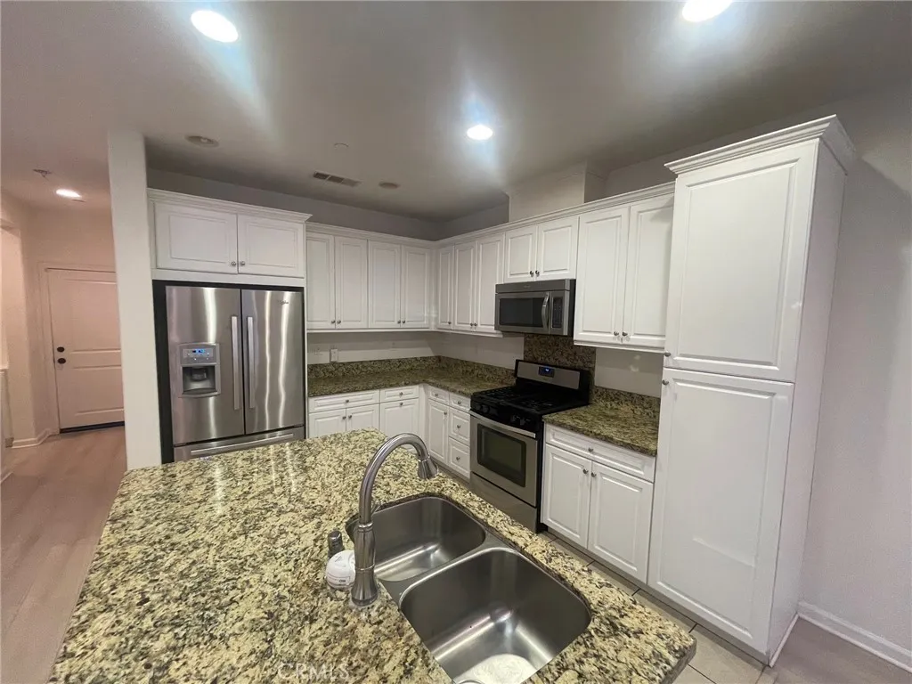 Great Location! Gated community, 2-story end unit with extra landscaped yard by front door. Wood flooring throughout the house. Open floor plan combining living room, kitchen and dinning room. Side door to private side yard. Kitchen with stainless steel appliances including the refrigerator, granite counter tops with white cabinets. Kitchen island with sink can be breakfast bar. Half bathroom downstairs, extra large storage space under the stairs, 2 car garage with direct access to the house. Upstairs is 4 bedroom, 2 bathroom and laundry room. Large master bedroom with walk-in closet. Hallway bathroom with dual sink and shower with tub. Community pool, park and BBQ area. About 2 miles to Ontario Mills, Costco and all the restaurants and shops.