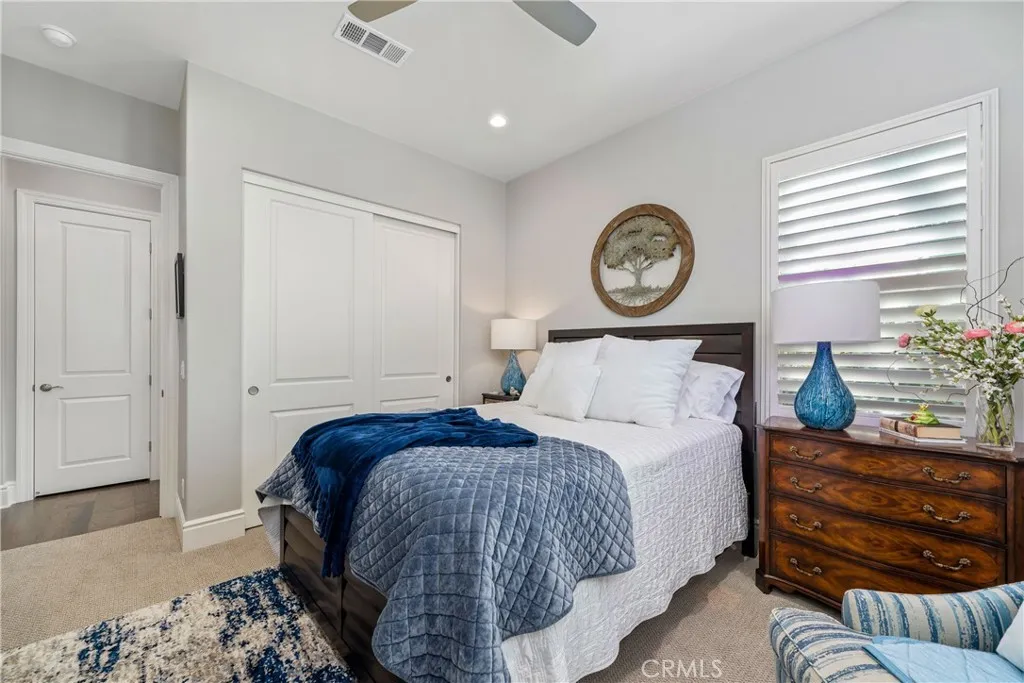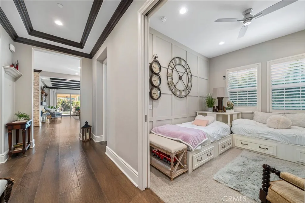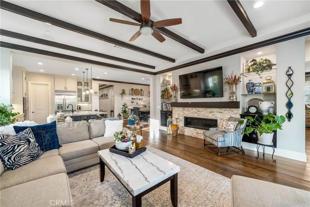 Welcome to luxury living in the prestigious 55+ gated community of La Floresta. This stunning single story residence showcases impeccable craftsmanship where no expense was spared. Soaring ceilings and an open floor plan create a light-filled, expansive feel, complemented by gorgeous wood flooring throughout. The highly upgraded kitchen is a showstopper, featuring leathered granite countertops, a massive island, premium finishes, and an oversized walk-in pantry...perfect for both everyday living and entertaining. The home offers three bedrooms, one is currently being used as a den with sliding pocket doors. It features a thoughtfully designed layout that provides privacy and comfort. A secondary bedroom and full bathroom are located at the front of the home, along with an additional half bath for guests. The spacious primary suite is a true retreat, with wood beams, and tall ceilings, boasting a beautiful en suite bathroom and a generous walk-in closet. The family room is accented by striking wood beams and an impressive wall of sliding glass doors that span nearly the entire length of the space, opening almost completely to seamlessly blend indoor and outdoor living. Situated on a large lot, the backyard is an entertainers dream with a covered patio extension, pergola, lush grass area, mature fruit trees, and a private spa, ideal for relaxing or hosting gatherings. Every detail, finish, and design choice has been carefully curated, offering refined elegance in a serene, resort-style setting. This exceptional home perfectly captures the best of La Floresta living.