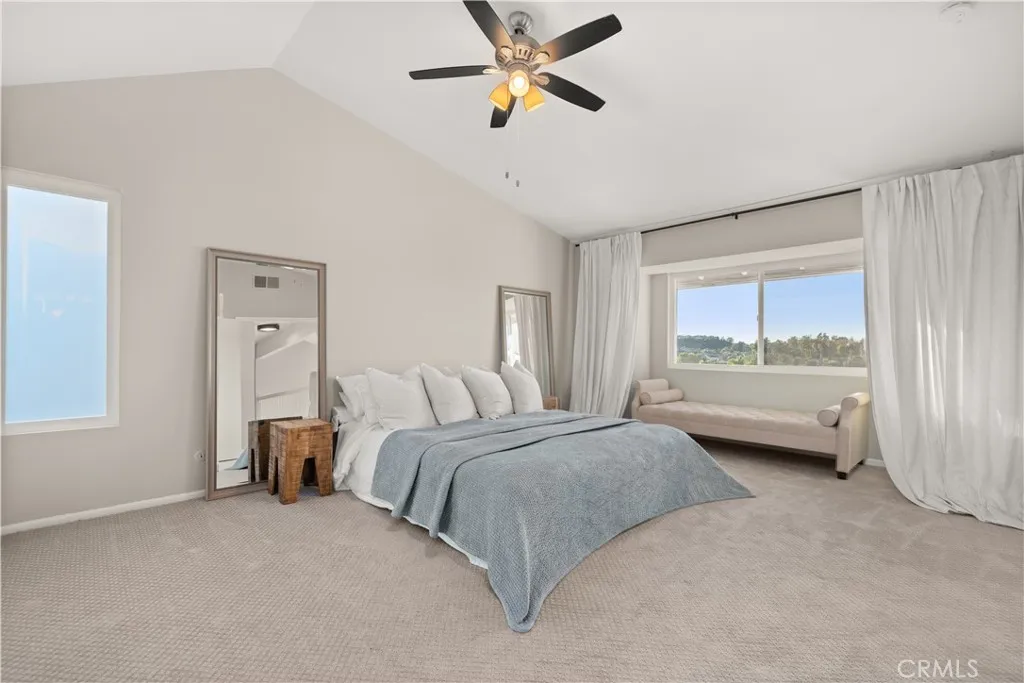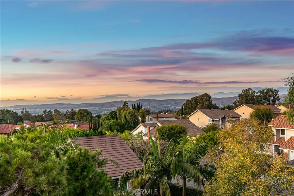 Sweeping sunset and hilltop views define this exceptional corner-lot pool home in one of Anaheim Hills most sought-after neighborhoods. Designed for comfort, privacy, and effortless entertaining, the home offers a peaceful setting paired with resort-style outdoor living. This 4-bedroom, 3.5-bath residence spans approximately 2,196 square feet on a generous 9,700 square foot lot. The main floor is anchored by an expansive living area highlighted by a striking 16-foot sliding glass door that opens fully to the backyard, creating a true indoor-outdoor lifestyle. The remodeled kitchen is thoughtfully designed for both daily living and entertaining, featuring a 6-burner dual-oven range with griddle, waterfall-edge countertops, chrome fixtures, AquaTru reverse osmosis alkaline water system, integrated glass washer, and smart cabinetry with tower storage and pull-out shelving. A separate formal dining space provides additional room for gatherings. A main-level bedroom includes its own fireplace, backyard access, and an ensuite bath, along with a convenient guest half bath. Upstairs, the primary suite enjoys mountain views, vaulted ceilings, a walk-in closet, and a spacious bathroom with dual sinks, soaking tub, vanity area, and separate shower. Two additional bedrooms share an updated hall bath. Luxury vinyl flooring runs throughout the home. The attached 3 car garage offers epoxy flooring, EV charging capability, and laundry with direct interior access. The backyard is a private retreat with a sparkling pool and spa, complemented by a new aluminum patio cover featuring built-in l