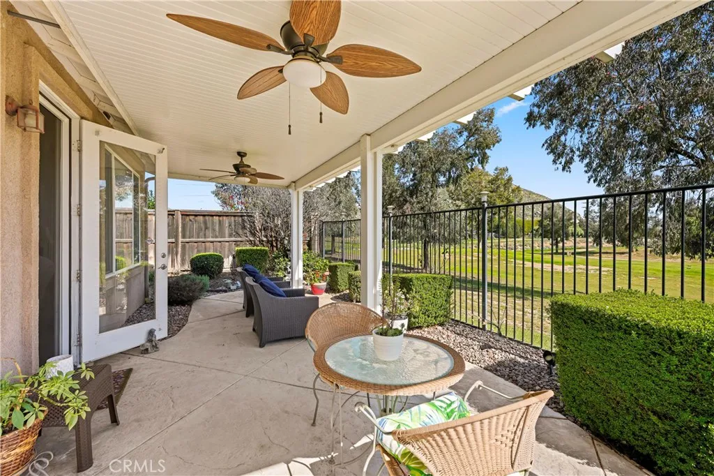 Welcome to resort-style living in the highly sought-after, gated 55+ Four Seasons Hemet community. This beautifully maintained single-story home is located on a quiet, well-kept street and offers comfort, functionality, and low-maintenance living. Interior Features: 2 spacious bedrooms, 2 full baths, plus two versatile office/den spaces Private primary suite with walk-in closet Ensuite bath with soaking tub, separate shower, dual vanities, and private commode Bright, open living areas; tile flooring with carpet in living and dining, bedrooms and offices Plantation shutters and ceiling fans throughout Kitchen with wood cabinetry and newer appliances Outdoor & Garage: Peaceful backyard with Alumawood solid patio cover, planter beds, golf course & mountain views Automated sprinkler system front and back Garage with epoxy flooring, built-in cabinetry, and overhead storage Community Amenities: 24-hour security, clubhouse with Bistro, ballroom, theatre, library, billiards, game room, fitness center, salon, resort-style pool and spa, covered BBQ area, bocce ball, shuffleboard, tennis and pickleball courts. Location: Conveniently located near Diamond Valley Lake, Temecula Wine Country, Palm Springs, San Diego, and Los Angeles. Turnkey and move-in readycome experience the exceptional Four Seasons lifestyle. Schedule your private showing today.