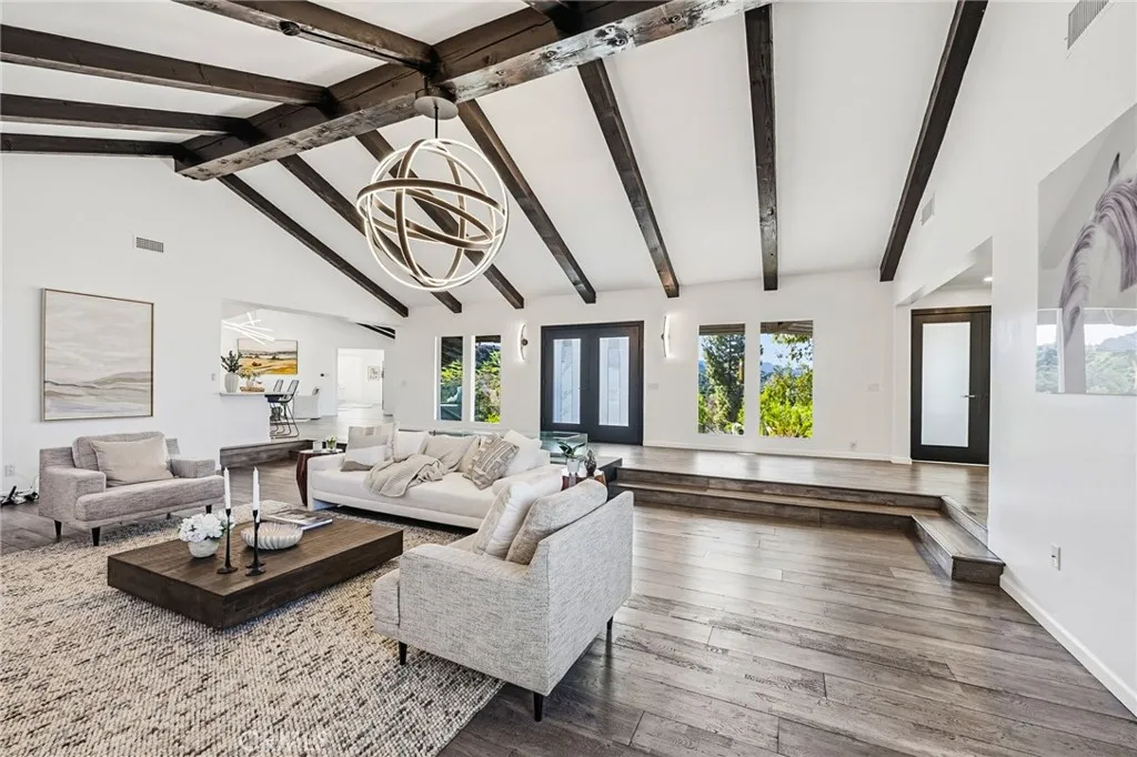 Built for sunsets! Hilltop views and stylish California living come together in this private Westlake Village estate. Perched at the top of a hill, this custom-built home offers refined style, privacy, open skies and sweeping sunset views in the idyllic Westlake Trails. A grand double-door entry opens to soaring, beamed ceilings, wide plank flooring and expansive walls of glass that fill the home with natural light and panoramic views from nearly every living space. Sleek and stylish contemporary finishes blend with warm California character, creating an atmosphere that feels sophisticated and relaxing. A grand scale living room with dramatic ceilings flows past a built-in bar and into the formal dining area, bordered by a wall of windows and glass capturing hillsides and sunsets. The open layout continues into an inviting kitchen and family room. The thoughtfully-designed kitchen, with oversized island, glass-front cabinetry and Carrara marble surfaces is equipped with high-end appliances including built-in espresso and wine refrigeration. A statement, full-height tiled fireplace anchors the family room, while sliding doors open to a veranda spanning the length of the home capturing golden light and sunset views. The flexible floor plan provides versatility with two-bedroom suites on separate levels, plus a large loft with en-suite bath and private balcony, ideal to create a fourth bedroom, office or studio. A private window-lined corridor leads to a tranquil primary suite filled with natural light, hillside views, private balcony and direct access to the pool terrace. The