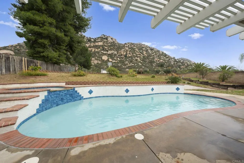 Welcome to 25072 Poderio Drive, a beautifully positioned single-family home in Ramona's desirable San Diego Country Estates. Situated on a spacious approximately 0.58-acre lot at the foot of your own private mountain, this well-appointed residence offers serene country living with room to roam. This classic ranch-style home features 3 generous bedrooms and 2 full bathrooms, with approximately 2,298 square feet of living space thoughtfully laid out for both everyday comfort and entertaining. Natural light fills the expansive interior, enhanced by upgraded double-pane windows and recessed cam lighting. Custom cabinetry throughout the kitchen and bathrooms, along with a charming built-in bookcase nook, adds warmth and character. Granite countertops extend seamlessly from the kitchen into the bathrooms, creating a cohesive and elevated design. A cozy wood-burning fireplace anchors the living space, perfect for cooler evenings. Step outside into your private backyard retreat, ideal for al fresco dining, gardening, recreation, or simply soaking in the peaceful surroundings. The fully fenced property offers privacy and versatility, complete with a basketball court and storage shed. The potential for this flat usable space is endless. See it to believe it! The sparkling pool has been recently renovated with new plaster, coping, and flagstone, providing a refreshed and inviting space to relax on warm California days. A fully permitted sunroom and pergola off the primary suite create an ideal setting for morning coffee or quiet evenings outdoors as you gaze at your private mountain v