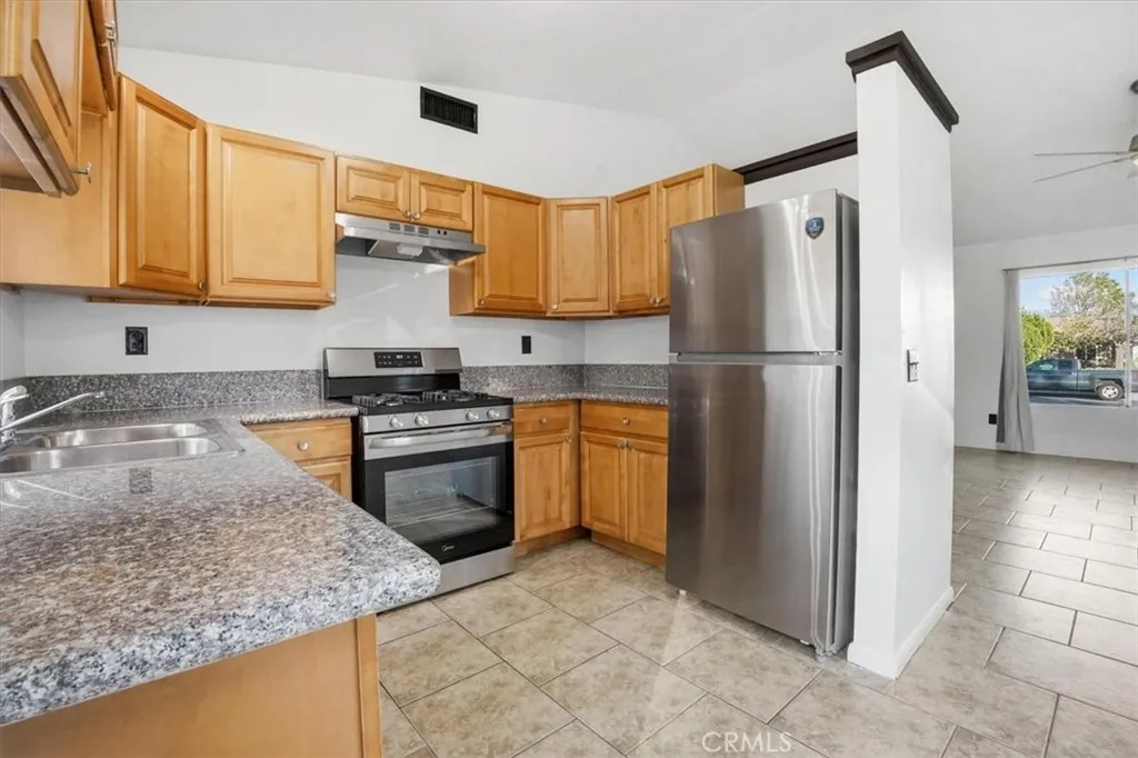 Move-in ready North San Bernardino home located just minutes from Cal State San Bernardino and convenient freeway access. This 2 bedroom, 1 bathroom single-story home offers 873 square feet of living space on a spacious 7,200 square foot lot, providing room to expand, entertain, or customize your outdoor space. Recent upgrades include brand new stainless steel appliances featuring a refrigerator, dishwasher, gas stove and oven, and hood range. The interior has been freshly painted and enhanced with new kitchen lighting and modern ceiling fans in both bedrooms, creating a clean and updated feel throughout. The attached two-car garage adds functionality and storage, while the generous lot offers flexibility for gardening, outdoor gatherings, or future possibilities. Whether you are a first-time home buyer, purchasing for a student attending CSUSB, or seeking an investment opportunity, this property offers strong value in an established neighborhood with sidewalks and nearby amenities.