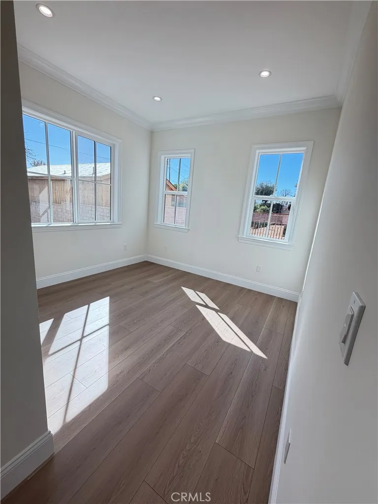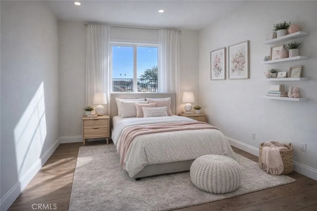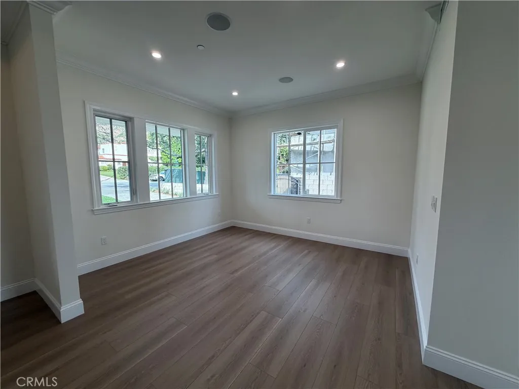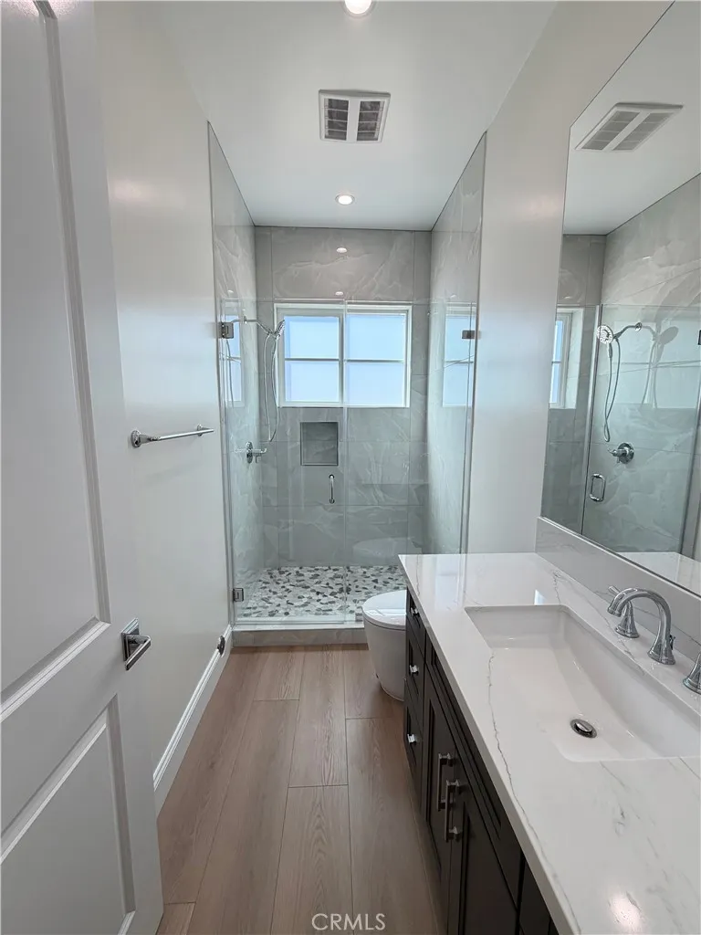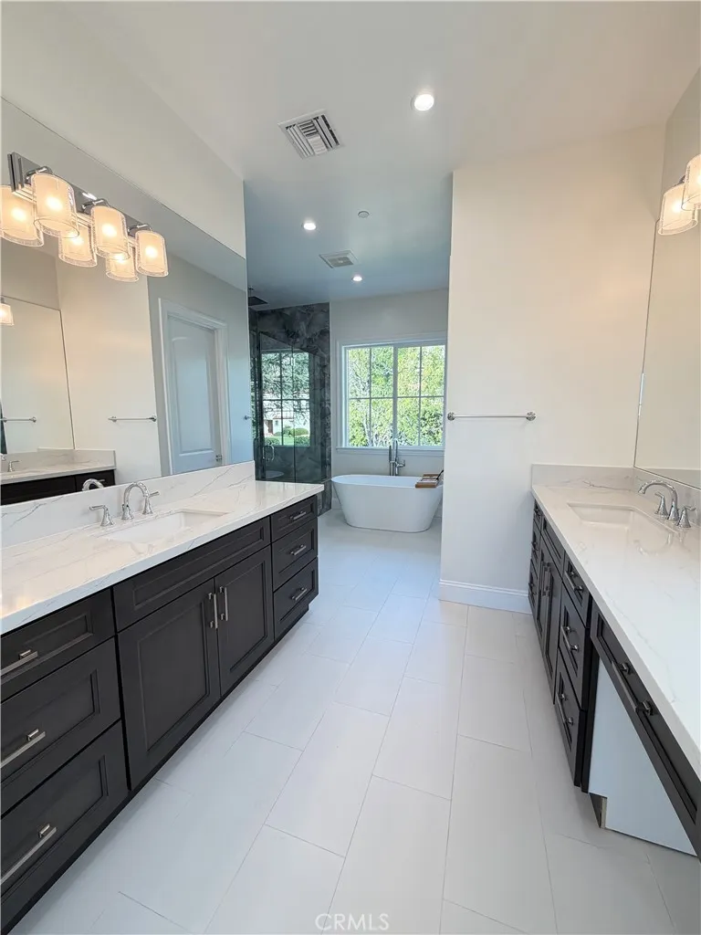 Welcome to this exceptional transitional Craftsman residence, meticulously rebuilt following the 2025 Eaton Fire with an emphasis on modern efficiency, safety, and refined living. The home is fully electric and energy-efficient, featuring owned solar panels with battery storage and separate HVAC systems for each level to ensure optimal comfort year-round. The interior offers a thoughtfully designed open-concept floor plan with recessed lighting, waterproof vinyl flooring, and dual-glazed thermal windows throughout. The kitchen is equipped with quartz countertops, solid wood cabinetry, LG appliances, a double oven, a spacious island with bar seating, and a wet bar with a built-in beverage center. A large walk-in pantry provides abundant storage, while built-in surround sound enhances the kitchen, family room, and dining areas. The formal living room is distinguished by high ceilings, an electric fireplace, and custom built-in shelving and cabinetry. A solid wood staircase with wrought-iron detailing adds architectural elegance and leads to a gallery. Bathrooms are finished with scratch-resistant porcelain tile, bidet toilets, built-in handheld fixtures, and frameless or semi-frameless glass enclosures. One upstairs bathroom includes a bathtub well-suited for families, while the primary suite features a spa-inspired bathroom with a freestanding soaking tub and a rainfall shower with handheld. All bedrooms are pre-wired for televisions and include closets with built-in shelving. The primary suite offers two walk-in closets, one featuring a center island, 2 separate vanities in