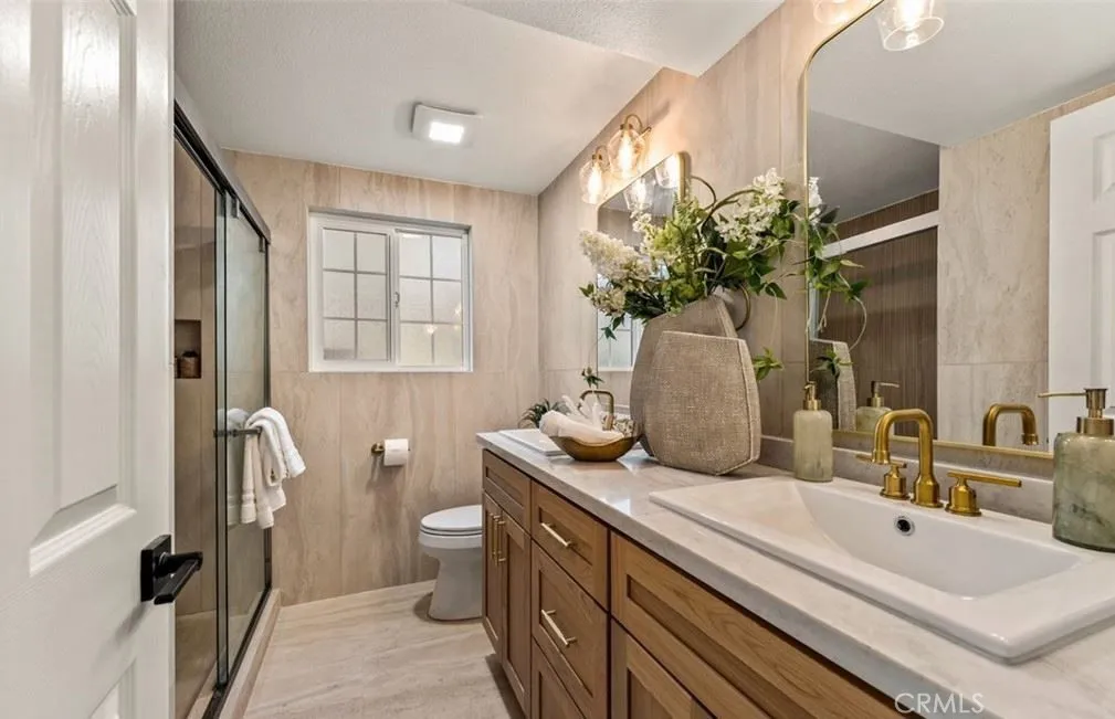 Welcome to 12 Woodleaf, ideally situated in the highly desirable Woodbridge Village community. This completely remodeled home showcases an elegant blend of transitional neutral tones and modern designer finishes throughout. Enter thru the private partially enclosed patio and garden. The open-concept kitchen with countertop seating features oak cabinetry, Taj Mahal quartz countertops, new stainless steel appliances, and brushed gold hardware creating a warm yet sophisticated space perfect for everyday living and entertaining. The living and dining areas feel light and bright, enhanced by new LED lighting, oak engineered vinyl flooring, and a custom fireplace with designer mantle. Numerous newer dual-pane windows fill the home with an abundance of natural light. Both bathrooms have been thoughtfully reimagined with a spa-like ambiance, offering floor-to-ceiling tile, Taj Mahal countertops, and a refined modern bohemian aesthetic. Additional upgrades include fresh interior paint, a new AC unit, updated moldings, and designer hardware throughout. The home includes one covered parking space along with ample open guest parking; No designated garage. Conveniently located near Woodbridge High School, the scenic Woodbridge Lakes, and popular shopping destinations including Crossroads and Westpark Plaza. Enjoy a short commute to University of California, Irvine and the vibrant Irvine Spectrum Center. A beautifully upgraded home in an unbeatable location this one is not to be missed.