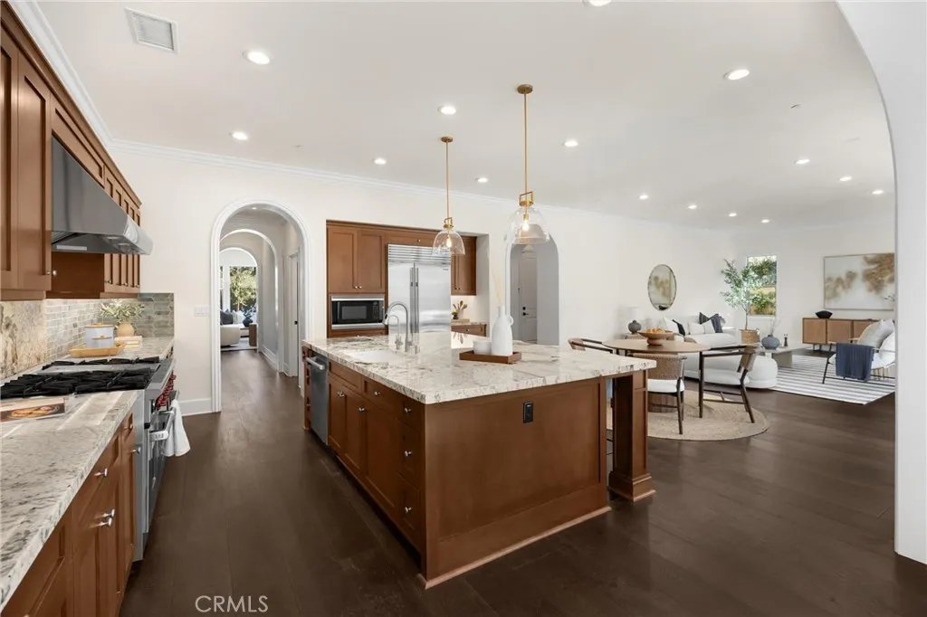 TWO HOMES on ONE lot! The fully detached SINGLE LEVEL guest house with TWO en-suite bedrooms connected by a central family room, offers exceptional privacy and versatility. No Mello Roos Tax! Exclusive 24h guard gated community. 77 Clifford is a luxurious award winning estate The Grove Plan 2. Designed with intentional spaces for grandparents, parents, and children alike. Private retreats and generous gathering areas create harmony for every generation where family legacy and modern comfort coexist beautifully. Embracing a Japandi aesthetic of organic natural materials earthy wood and stone, the design balances simplicity, minimalism, and functionality; creating a calming, harmonious feel. Natural light flows through numerous windows, creating a bright, airy atmosphere throughout. The high-ceiling stairway leads to a versatile loft space. The bedrooms are all en-suite, are uniquely spacious, and designed with privacy in mind. The luxurious primary suite features an enlarged dream walk-in closet with checkered flooring, that attaches directly to the private office. A freshly renovated spa-inspired bathroom, dual vanities, and an additional walk-in closet completes the space. The great room flows seamlessly into a host's dream kitchen, outfitted with PRO Sub-Zero and Wolf built-in appliances. The versatile butlers pantry is perfect as a coffee station, secondary prep area, or discreet serving space when entertaining. This extension of the kitchen enhances both functionality and flow for elevated everyday living. The main home and guest house are lined with vast windows and to