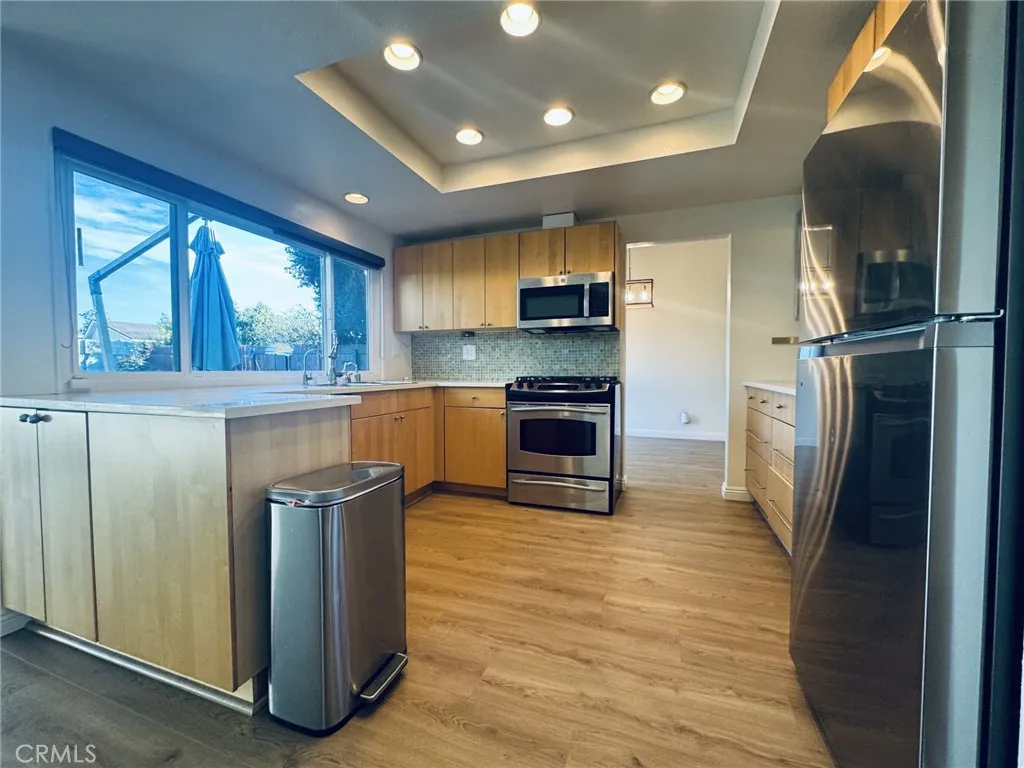 Welcome to 14762 Foxcroft, a beautifully maintained single-story home on a quiet cul-de-sac in the desirable Tustin Meadows community. This light-filled home offers 4 bedrooms and 2 bathrooms with new flooring throughout, recessed LED lighting, and travertine tile in the bathrooms. The spacious living and dining areas feature vaulted ceilings, a cozy fireplace, and large windows with sliding door access, bringing in abundant natural light. The remodeled kitchen includes custom cabinetry, quartz countertops, recessed LED lighting, and ample storage, and opens to the family room with vaulted ceilings and patio access. The primary suite overlooks the private backyard and features a fully remodeled bathroom with a walk-in shower. The backyard offers a large patio, green lawn, and mature fruit trees including clementine, lemon, and pomegranate. Additional highlights include an attached two-car garage with EV charger, laundry area, and extra storage. Residents enjoy Tustin Meadows amenities including two pools, two clubhouses, and walking distance to the newly renovated Centennial Park. Convenient access to the 5, 55, and 22 freeways and 241 toll road, with shopping and dining nearby at The Marketplace and The District.