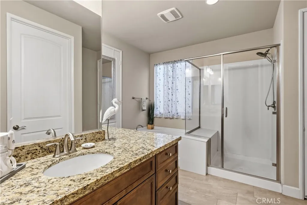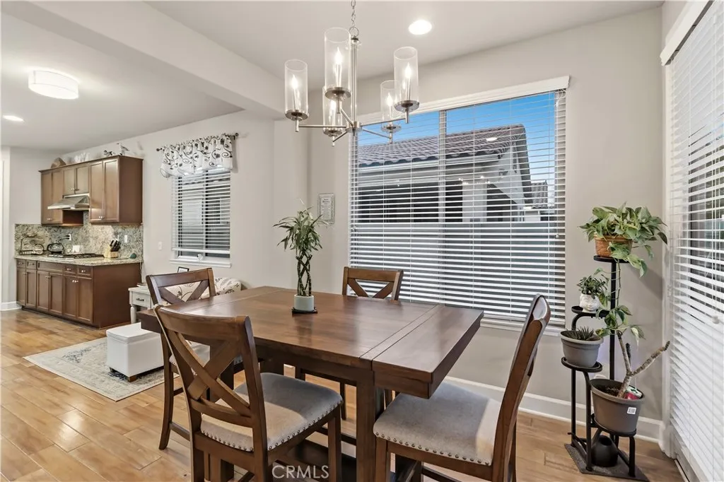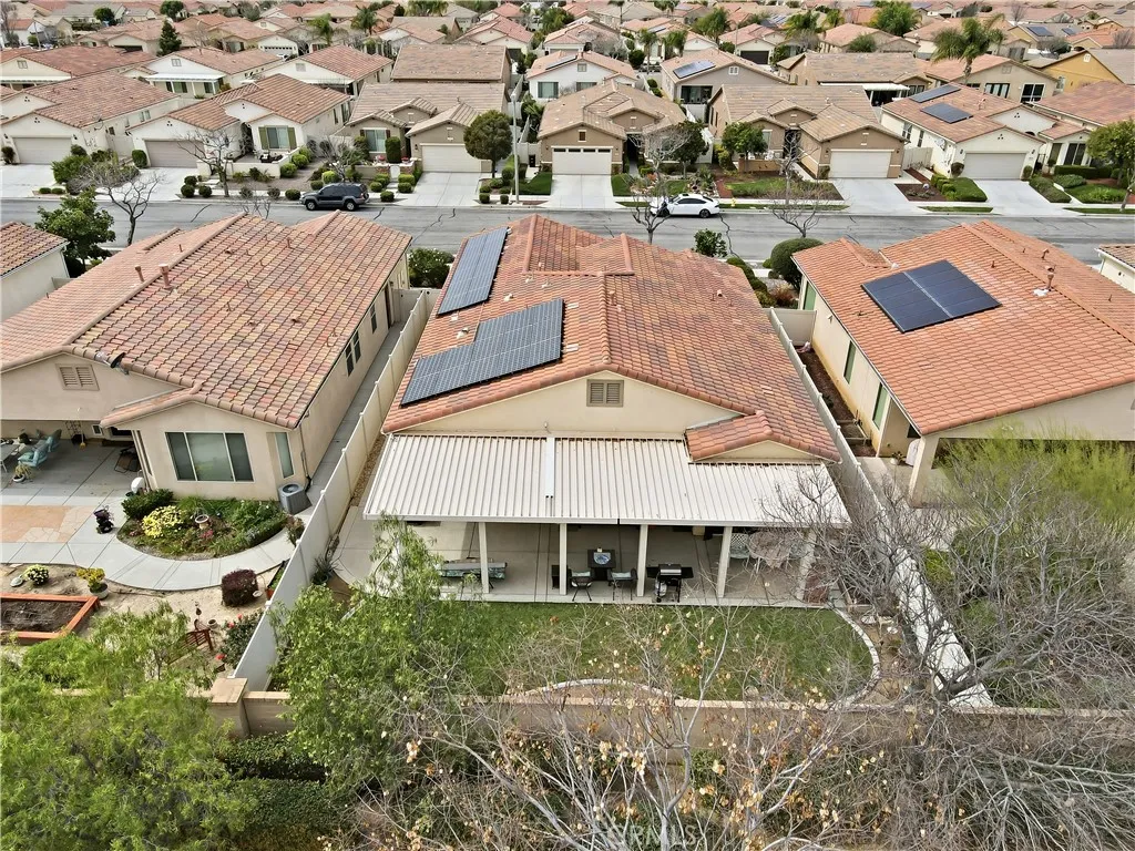 Turn key home Located in the highly sought-after 55+ Solera Diamond Valley Community by Del Webb, this beautifully upgraded 3-bedroom, 2-bathroom home offers the perfect blend of comfort and style. The thoughtfully designed open-concept layout features a spacious kitchen that seamlessly connects to the living and dining areas, creating an ideal space for both everyday living and entertaining. The kitchen includes stainless steel appliances, granite countertops, a large center island with breakfast bar, upgraded fixtures, a pantry, and a generous dining area. Wood flooring runs throughout the main living and high-traffic areas. The laundry room includes additional storage cabinets and a utility sink. The spacious primary suite offers plenty of room to relax, while the primary bathroom features dual sinks, a soaking tub, and a step-in shower. The second and third bedrooms are also well sized. Additional upgrades include paid solar panels, a central vacuum system, electric vehicle charging station, fire suppression sprinkler system, ceiling-mounted garage storage, and gutter guards designed to help prevent leaf buildup, all adding convenience, efficiency, and peace of mind. The front patio courtyard provides a great space for relaxing or entertaining. The backyard has been meticulously maintained and features a covered patio, concrete hardscape, low-maintenance artificial grass, and space for shrubs and flowers. Residents of Solera enjoy access to an impressive community center featuring a fitness center with walking track, library, billiards room, conference rooms, theater, i