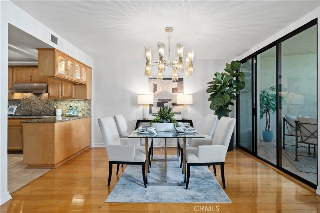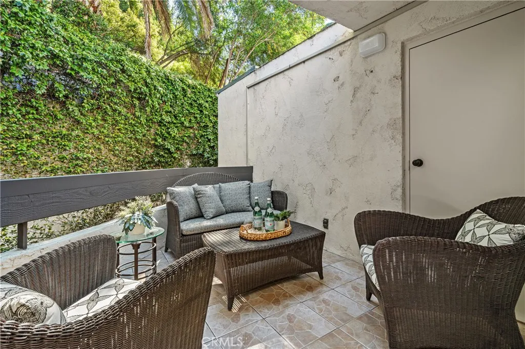 Rarely available within Bel Air Courtside, an intimate 16 residence enclave known for its quiet setting, no adjacent residential structures, and absence of long interior corridors. Semi private elevator access opens to your entry landing, shared with only one neighboring residence. The spacious great room with fireplace and large seating hearth flows into the formal dining area, out to the front balcony through corner positioned sliding glass doors, adding 300+ combined sq. ft. of outdoor living between the front and rear balconies. In the evening, enjoy views of the Getty Museum illuminated against the hillside. A built in bar with a sink connects the living areas to the kitchen for effortless entertaining. The kitchen features glass front cabinetry with integrated lighting, dual ovens, refrigerator, granite countertops, stainless hood, GE Profile cooktop, coffered ceiling with integrated lighting, and breakfast bar seating. The adjacent multi purpose nook includes a built in work desk and flexible space ideal for a home office, creative studio, or casual dining. A private hallway lined with storage closets and cabinetry includes the third bathroom and separates the two bedroom suites. Both suites feature sliding glass doors opening to the rear balcony overlooking the Bel Air hillside, where deer can be seen. The primary suite offers a walk in closet plus an additional closet and a spa inspired bath with oversized jetted soaking tub, dual sinks with seated vanity, separate shower area, and private water closet. The secondary suite includes its own walk in closet and full b