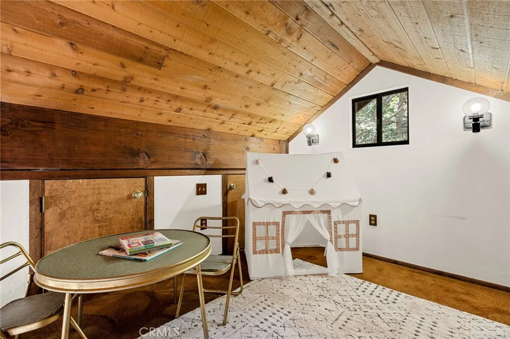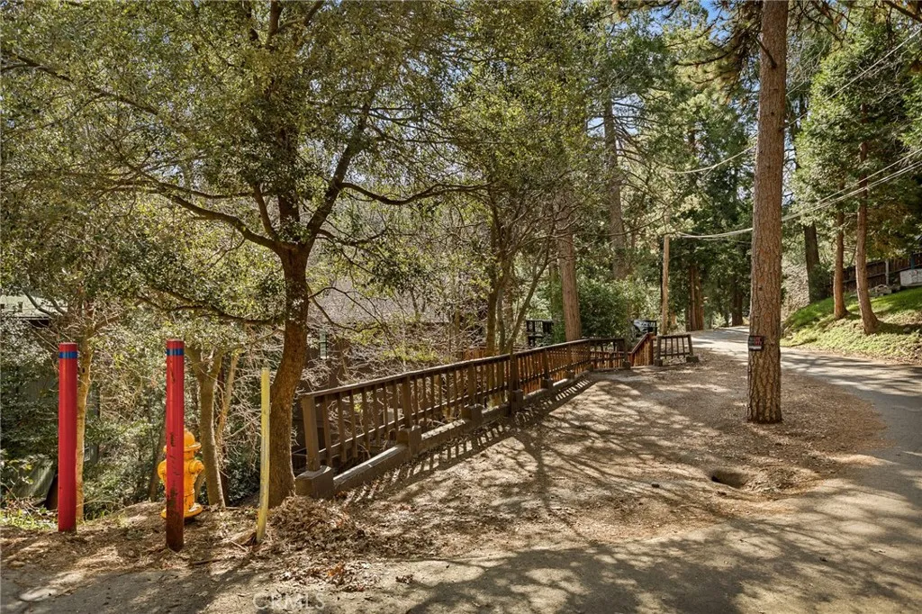 Tucked quietly among the trees, this woodsy cabin captures the essence of mountain living. A spacious level driveway offers plenty of parking, while a charming bridge walkway creates a storybook approach and easy level entry into the home. Inside, the living room welcomes you with soaring vaulted ceilings and a wood-burning fireplace as focal point creating that classic cozy cabin atmosphere. The main level features the living room, dining area, kitchen, and half bath, along with a playful loft space perfect for reading, games, or extra sleeping or storage. A mini-split air conditioning unit ensures comfort year round. A sliding door opens to the upper deckan ideal spot for morning coffee or relaxing in the peaceful forest surroundings. Downstairs are three bedrooms, a full bathroom, and a convenient laundry closet. One bedroom enjoys access to its own private deck, creating a quiet escape among the trees. The lower level also offers separate entry, providing flexibility for guests or extended stays. Additional storage/ workshop space is available in the buildup area below. Conveniently Located between Top Town and Crestline Village, and less than 5 minutes from glistening Lake Gregory. A moody mountain retreat in beautiful Crestlinefull of charm, character, and the peaceful feeling of being tucked away in the forest.