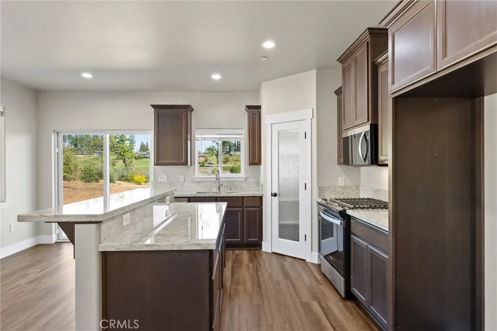 Youll fall in love with the thoughtful layout and quality craftsmanship of this newly built Anderson Builder Corporation 3-bedroom, 2-bathroom home. Situated on .43 of an acre, the property offers room to grow, a detached garage, and a charming backyard orchard with fruit trees ready to flourish. From the moment you step onto the welcoming covered front porch, youll feel right at home. Inside, natural light fills the spacious open floor plan, creating an inviting atmosphere perfect for both everyday living and entertaining. The beautifully designed kitchen is the heart of the home, featuring elegant marble countertops, a breakfast bar, stainless steel appliances, a gas range, microwave/range hood, and a classic farmhouse sink. A generous pantry and soft-closing cabinetry add both convenience and style. The kitchen flows seamlessly into the dining and living areas, where large windows and a sliding glass door frame peaceful backyard views and enhance the homes open, airy feel. Luxury vinyl plank flooring runs throughout, offering both durability and modern appeal. Additional upgrades include mini-blind window coverings, upgraded closet systems, and insulated interior walls between bedrooms and bathrooms for added privacy and comfort. Energy-efficient mini-split heating and air systems ensure year-round comfort. The detached garage is a standout feature, complete with insulated walls for temperature consistency, a convenient half bath, and RV hookups along the side ideal for hobbyists, travelers, or those needing extra flexibility. For added peace of mind and efficiency, the