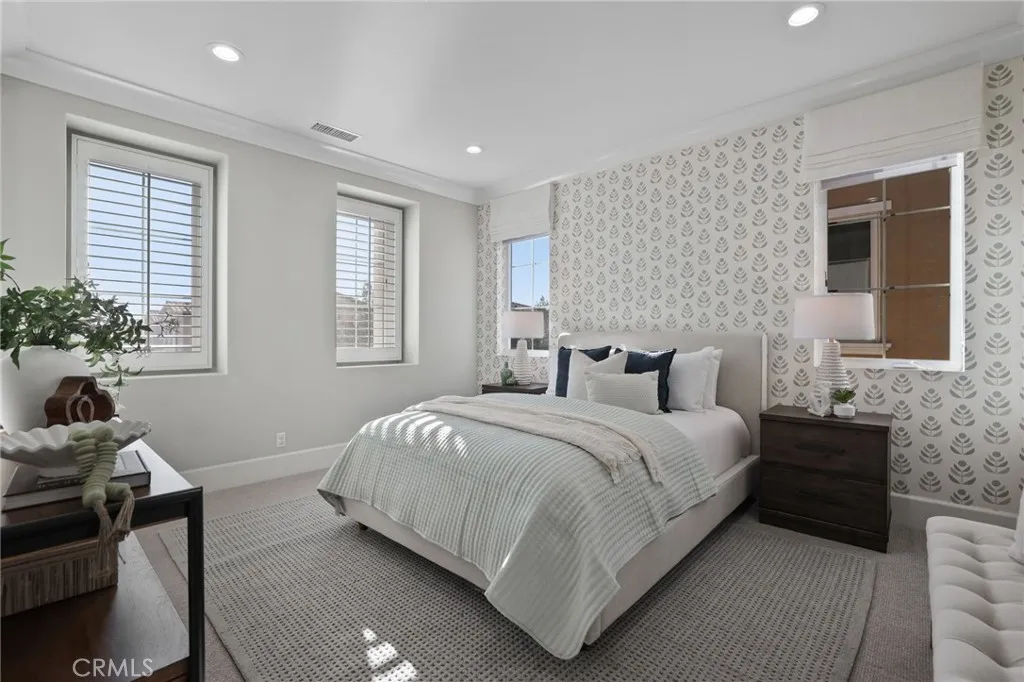 Located in the prestigious 24 hour guard gated community of The Groves at Orchard Hills, this stunning Padova Former Model Home welcomes you with a charming Mediterranean style exterior and manicured landscaping. Step inside to a bright and elegant entryway with stylish staircase and an open hallway that immediately showcases the home's thoughtful layout. The main living space offers an impressive open-concept design with floor-to-ceiling wood accent wall, expansive tile flooring, and abundant natural light. The gourmet kitchen is a true centerpiece, featuring sleek quartz countertops, a large center island with bar seating, stainless steel appliances, custom wood cabinetry, and designer pendant lighting. The kitchen flows effortlessly into the dining area and the spacious great room, creating the perfect setting for entertaining and everyday living. The inviting great room features a modern fireplace with custom built-in shelving and accent wall, providing both warmth and architectural character. Large sliding glass doors open to the backyard, allowing for seamless indoor-outdoor living. A downstairs room provides flexibility for guests, a home office, or additional living space. Upstairs, a spacious open loft provides a versatile secondary living area ideal for a media room or study space. The luxurious primary suite offers a serene retreat with abundant natural light and tranquil views. The spa-inspired primary bathroom features dual vanities, a soaking tub, and a spacious walk-in shower with elegant stone finishes. Two additional guest bedrooms are generously sized and