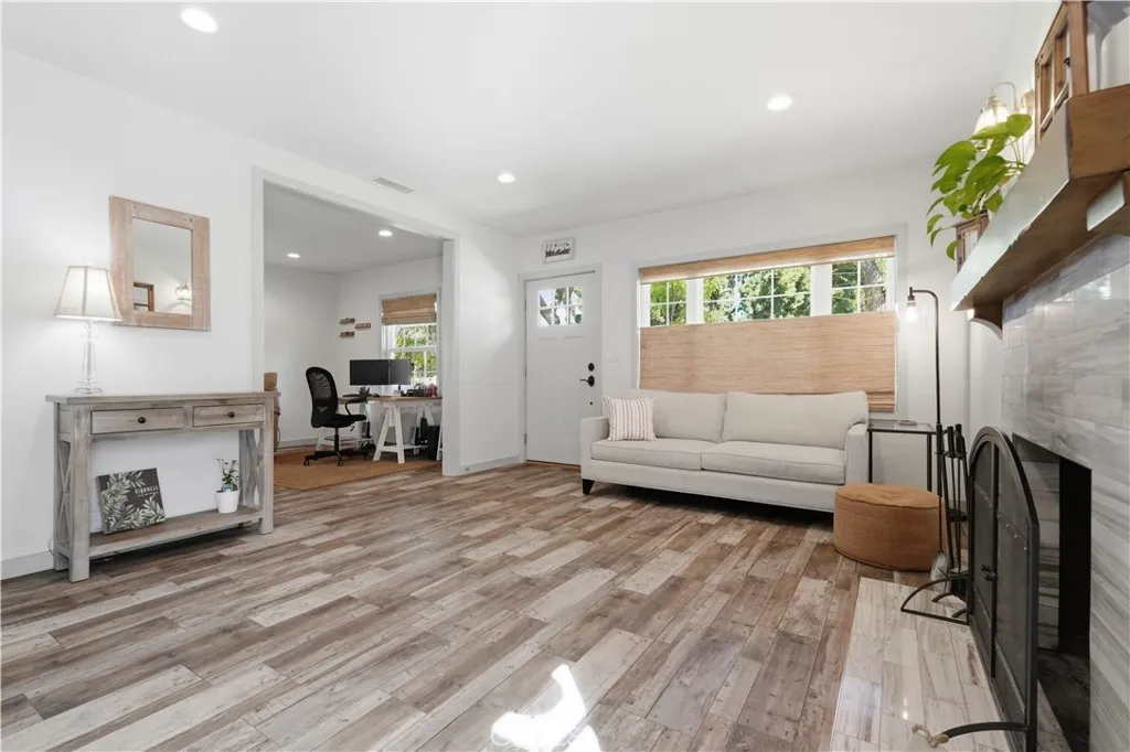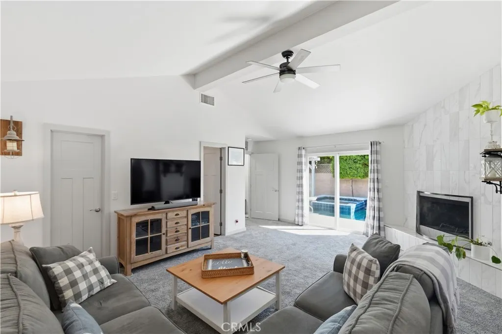 This beautifully remodeled home has been transformed down to the studs, offering modern comfort and thoughtful design throughout. Step inside to an inviting open-concept layout where the kitchen flows seamlessly into the living and dining areas. The kitchen features custom cabinetry and premium stainless-steel appliances, creating a bright and functional heart of the home. A cozy stone fireplace anchors the living space, enhanced by recessed lighting for a warm, welcoming setting. The spacious family room impresses with soaring cathedral ceilings and a stunning fireplace as its centerpiece, perfect for relaxing or entertaining. All bathrooms have been tastefully remodeled with elegant finishes and keen design details that elevate everyday living. The primary en-suite bedroom is a true retreat, boasting vaulted ceilings and a sprawling bathroom that opens directly to the backyardblending indoor luxury with outdoor access. Step outside to your private backyard oasis, complete with a covered patio, custom hardscape, and a recently built pool and spaideal for year-round enjoyment and resort-style relaxation. Additional highlights include central heating and air conditioning, dual-pane windows throughout, updated copper plumbing, and more. Best of all, this wonderful property overlooks Heartwell Park, delivering panoramic views and a serene front-porch setting right on the park. Enjoy peaceful mornings on your front porch facing the greenery and unwind in your resort-like backyard retreat! This must see home sits on a very generous lot, and is proximate to entertainment, freeway