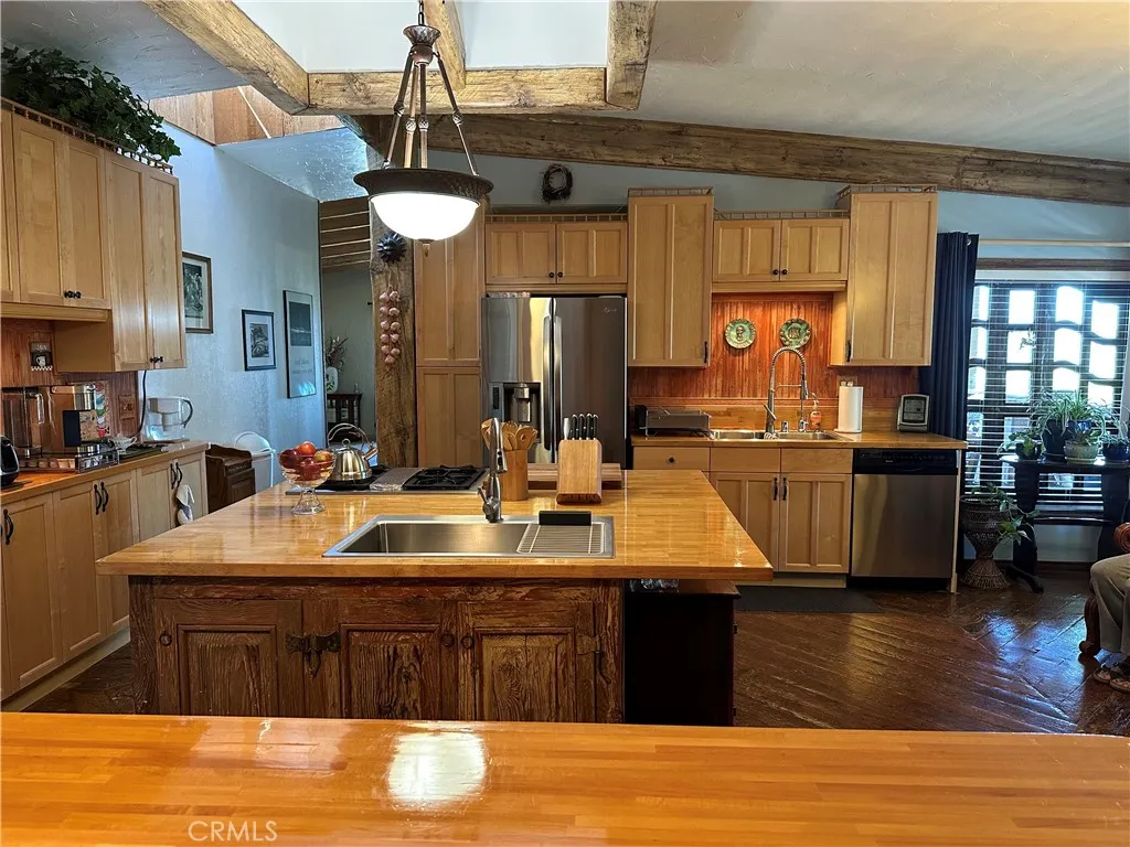 Welcome to this charming, one-of-a-kind 2,757 square foot custom pool home set on 9.37 scenic acres located on a PAVED road in Anza. Thoughtfully designed, this spacious residence offers 3 bedrooms and 3 bathrooms, with 2 bedrooms and 2 baths located on the main level, and a fully finished, recently updated, lower level area that adds a third bedroom, additional bathroom, a laundry room, and a generous bonus space ideal for a game room or secondary living area. Sellers have done many upgrades and updates over the years including, but not limited to, electrical, plumbing, water pump and tank, kitchen, windows, sliding glass doors, insulation and most recently a NEW Class A roof. Enter through a charming custom arched doorway into an open living room featuring a cozy fireplace, which flows seamlessly into the open country kitchen. The kitchen showcases rustic wood countertops, cabinetry, and exposed wood ceiling beams that enhance its warm, inviting feel and is equipped with a Jenn-Air gas stove with optional griddle and grill options, and an electric convection oven. Adjacent to the kitchen, the dining area is adorned with unique custom windows and a wood-burning stoveperfect for intimate family meals. The family room offers a second wood-burning stove, striking custom windows, open-beam ceilings, and a sliding glass door that overlooks the expansive pool area, offering breathtaking valley views. A convenient half bath is located just off the family room. On the lower level of the home, along with a third bedroom and large open space area, this level has a walk-in pantry and