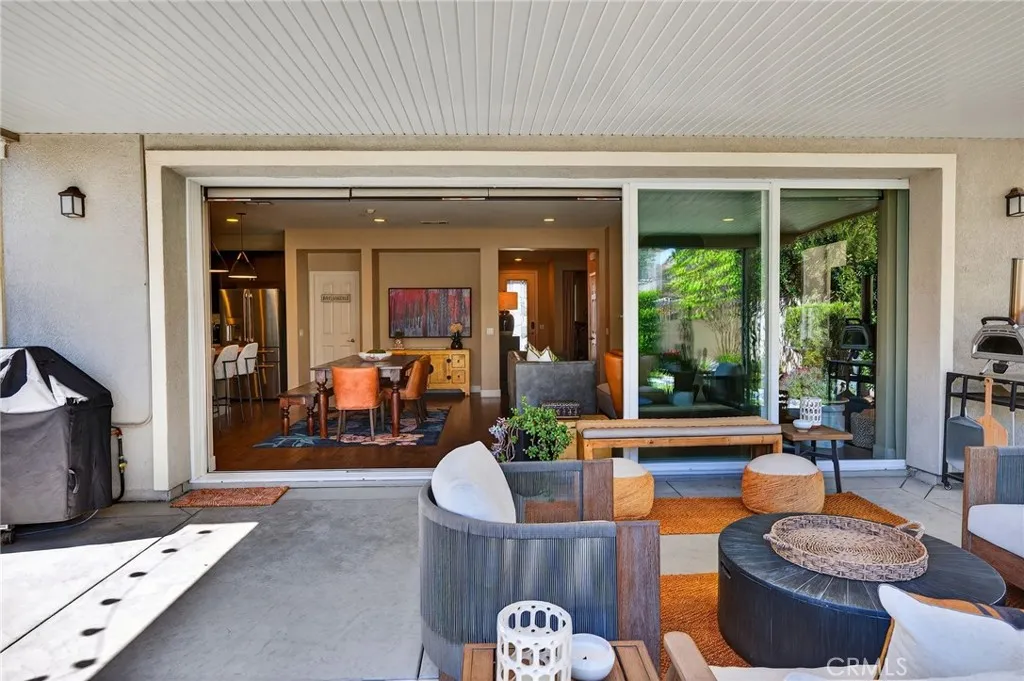 Welcome to one of the most desirable homes in the highly sought-after gated community of Roripaugh Ranchwhere modern design, comfort, and a true indoor-outdoor lifestyle come together seamlessly. Spanning approximately 2,816 sqft, this thoughtfully designed residence offers 3 bedrooms, 2.5 bathrooms, and a private office that can easily function as a 4th bedroom thanks to its spacious walk-in closet. From the moment you enter, youre greeted by a sense of peace and tranquility, enhanced by warm tones, natural light, and an open, inviting layout. The heart of the home is the expansive great room, dining area, and kitchenperfectly blended into one cohesive living space. A stunning 20-foot pocket door creates a truly unique feature, allowing the entire back wall to disappear and effortlessly connect the indoors with the covered patio, creating the ultimate setting for entertaining or relaxing in a serene environment. The kitchen is both stylish and functional, featuring a large center island with seating, quartz countertops, a custom backsplash, warm brown shaker cabinetry, and a walk-in pantry. The main living areas are finished with beautiful wood flooring, while the great room is anchored by a built-in fireplace. Modern window treatments throughout provide privacy while still allowing an abundance of natural light to fill the space. Upstairs, the oversized primary suite offers a true retreat, complete with a spa-inspired bathroom featuring a large soaking tub with custom tile surround, a walk-in shower, and ample space to unwind. Two additional bedrooms share a well-appointe