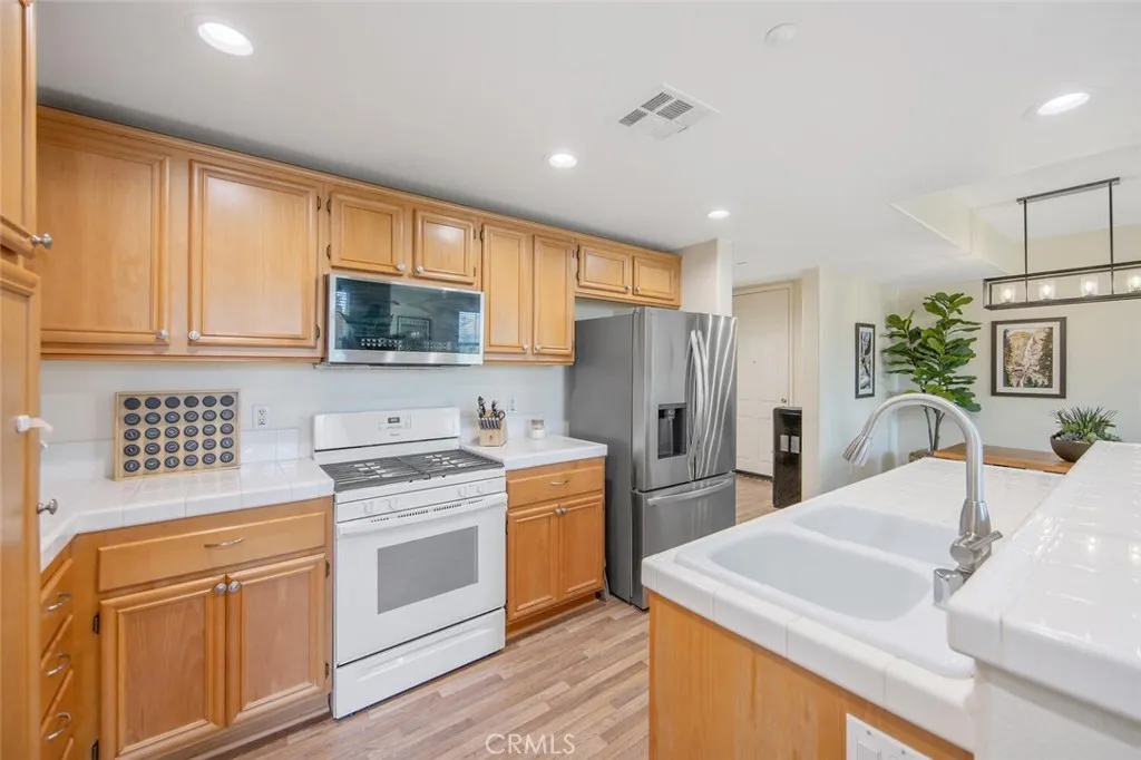 Welcome to resort lifestyle living at its best, in Village at the Park's Brookshire community! Natural light pours in through dual-pane windows (east and south facing) to this 3 bedroom, 2.5 bathroom condo, with 1561 sq ft of living space, high ceilings, recessed lighting, and an open floor plan. Designed for modern living, this is a 3rd floor corner unit, with only one shared wall and nobody above. Enjoy the private and peaceful living experience, all in the midst of a vibrant amenity-filled community. As you enter the front door, there is a half bathroom and laundry room, just inside the entry. You pass by the kitchen to an adjacent dining area and open living room with a balcony, just perfect for relaxing or drinking your morning cup of coffee as you start your day. To your left is the primary bedroom, with a walk-in closet and ensuite bathroom. On the other side of the living room, to your right, are the other 2 bedrooms, separated by a full bathroom. One bedroom is currently used as an in-home office, and the other as a yoga room. There are 2 single-car garages on the ground floor, offering abundant storage and secured parking for your vehicles. The resort-style amenities maintained by the HOA include pool, spa, gym/exercise room, BBQ area, clubhouse, playground, and beautifully landscaped common areas. The HOA fee covers water/sewer, trash, pest control, and exterior window washing, providing you with a low-maintenance and worry-free lifestyle. Situated near shopping, dining, parks and freeway access, this is a rare opportunity. Come and see this exceptional condo, ju