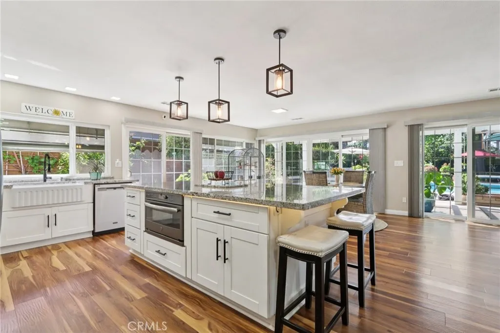 Welcome to this gorgeous Canyon Crest dream home, filled with charm, character, and exceptional indoor-outdoor living. This single-story pool home showcases stunning floor-to-ceiling Andersen windows(carry a transferable lifetime warranty) and double sliding doors that open to a true backyard oasis, flooding the home with natural light. Inside, youll find richly hued vinyl flooring throughout and a spacious, open layout designed for both comfort and entertaining. The large living room features a beautiful stone fireplace and flows seamlessly into the dining area. The remodeled kitchen is highlighted by natural stone countertops, abundant fresh white cabinetry, a tiled backsplash, newer appliances, and a large center island with built-in microwave, drawers, wine fridge, and bar seating. A pantry adds extra storage. The well-sized primary suite offers mirrored closet doors, custom built-in bookshelves, and a large sliding glass door leading to a private patio. The en-suite bathroom features a stand-alone vanity and a relaxing soaking tub. Two additional spacious bedrooms share a secondary bathroom with a tiled shower and direct access to the pool areaperfect for convenient outdoor living. Go outside to a beautifully landscaped backyard complete with a sparkling pool and spa, expansive grass area, two pergola-covered patios, and a garden shed/workshopideal for entertaining or relaxing in your own private retreat. Additional highlights include RV parking with a dedicated electrical hookup and a prime location near UCR, shopping, dining, schools, and easy access to the Interstat