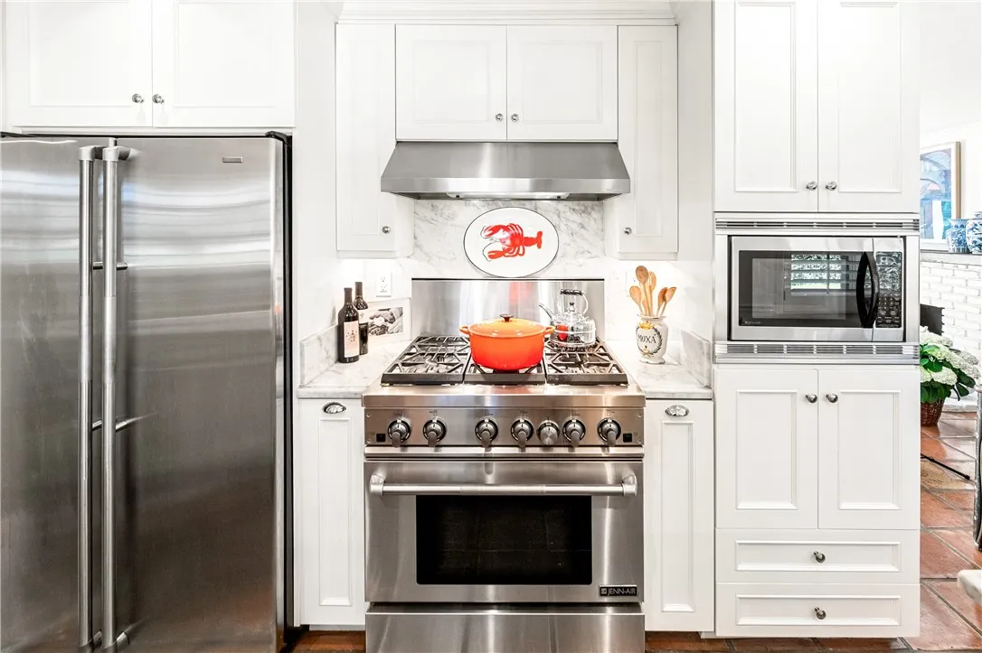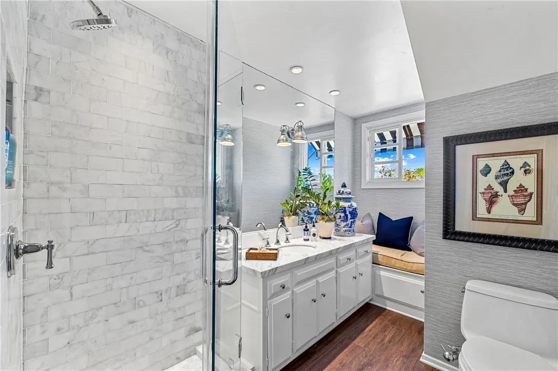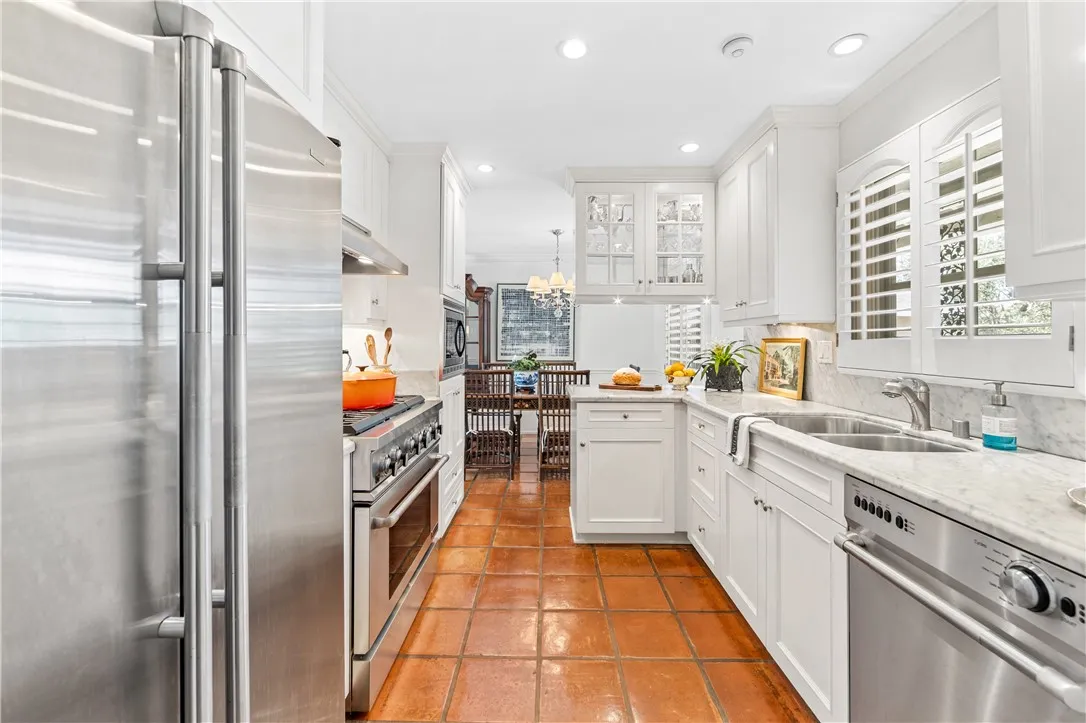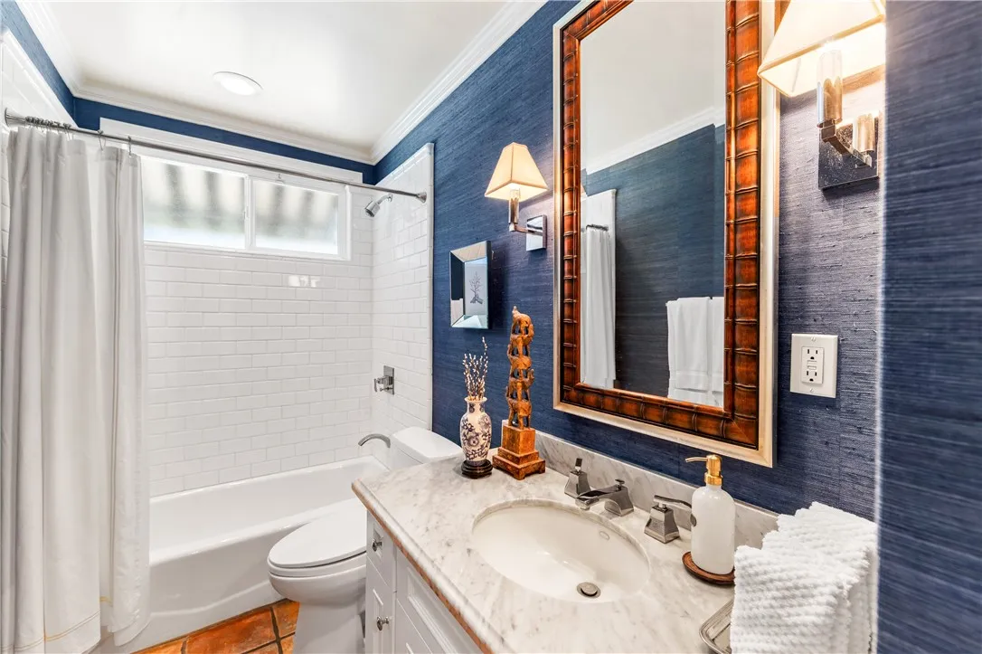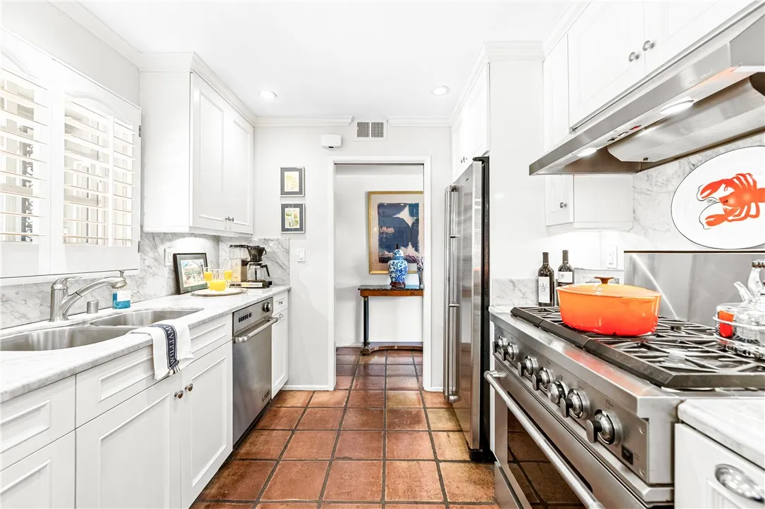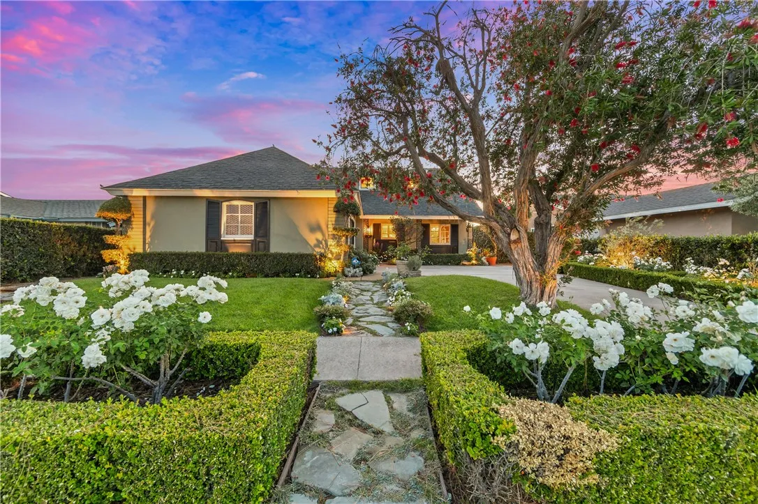 Tucked along a picturesque tree lined street in the heart of West Garden Grove, this exceptional Garden Park Plan 8, built by S&S Construction offers a rare opportunity to own one of the largest and most coveted floorplans in the neighborhood. Perfectly positioned directly across from Edgar Park, this 5 bedroom, 2 bathroom residence blends timeless character with elevated design, creating a true showpiece that checks all the boxes. Lovingly maintained by the original family since 1963, the home showcases craftsmanship rarely found today, including classic lathe and plaster construction. From the moment you step inside, Saltillo tile floors set a warm, inviting tone, flowing throughout the main living spaces and into the downstairs bedrooms. The reimagined guest bathroom is a designer moment, featuring a Kohler Village tub, white subway tile surround, Carrera marble vanity, and seagrass wall coverings. The interior has been elevated with smooth ceilings, recessed lighting, and crown molding, while dual-pane Simonton windows fill the home with natural light. At the heart of the home, the kitchen is both functional and refined, appointed with shaker cabinetry, pull-out shelving, spice racks, and stainless steel Jenn-Air appliances, including a 6-burner range. Designed with a curated aesthetic, this Acadian inspired residence features Ralph Lauren finishes, evoking the feeling of stepping into a Ballard Designs catalog. Upstairs, the primary suite is a true retreat, offering serene park views, a fireplace, and a walk-in closet. The spa-like bathroom is finished with Calcutta ma