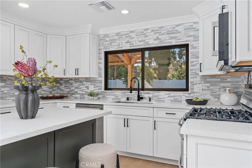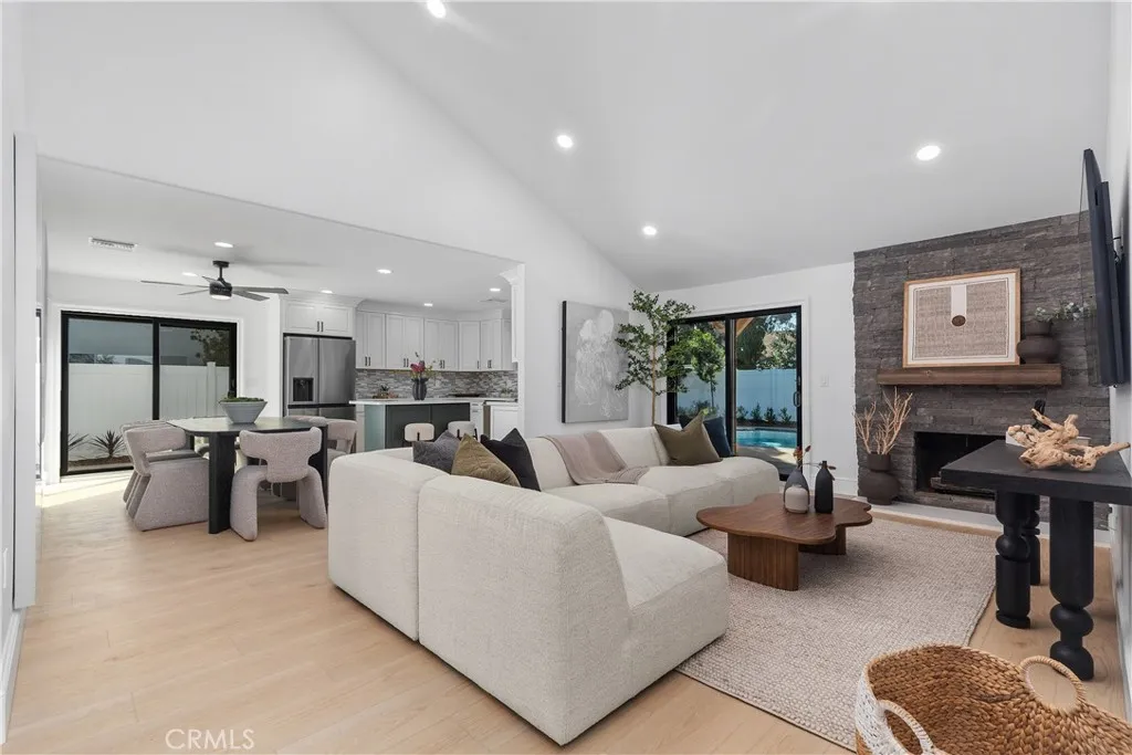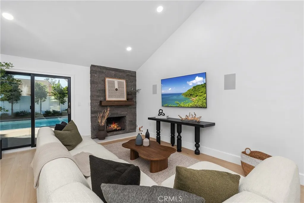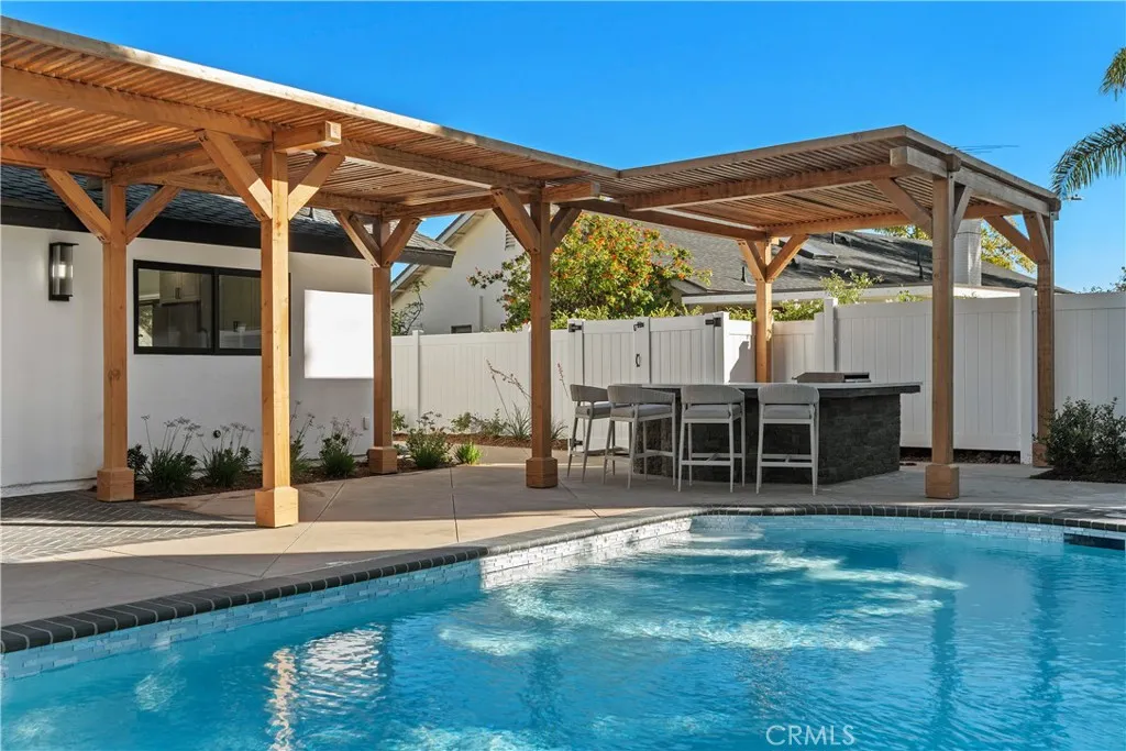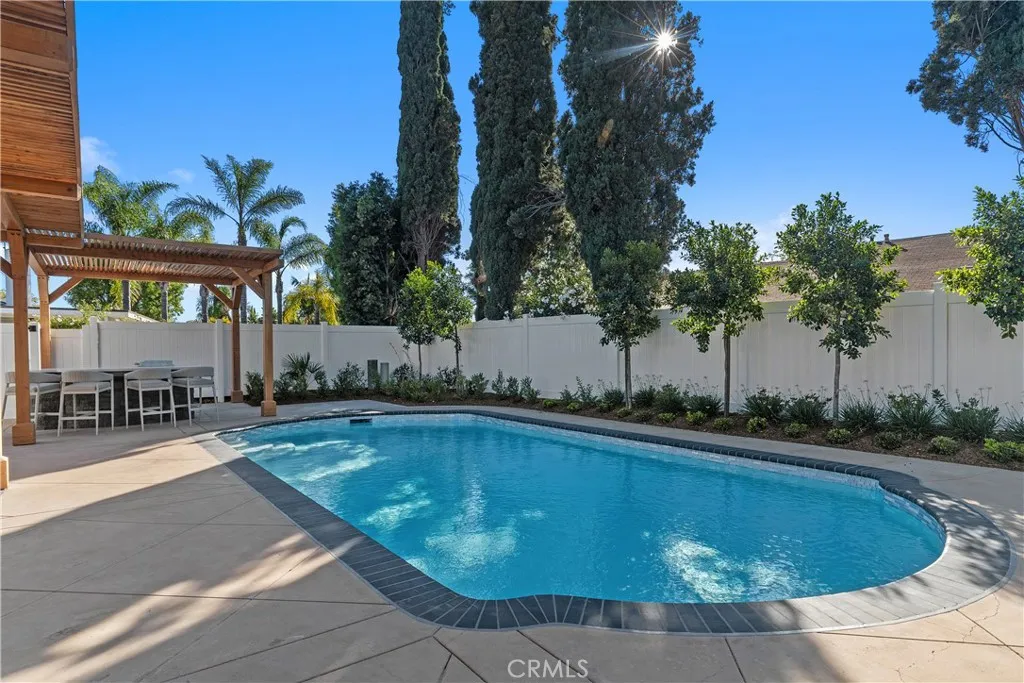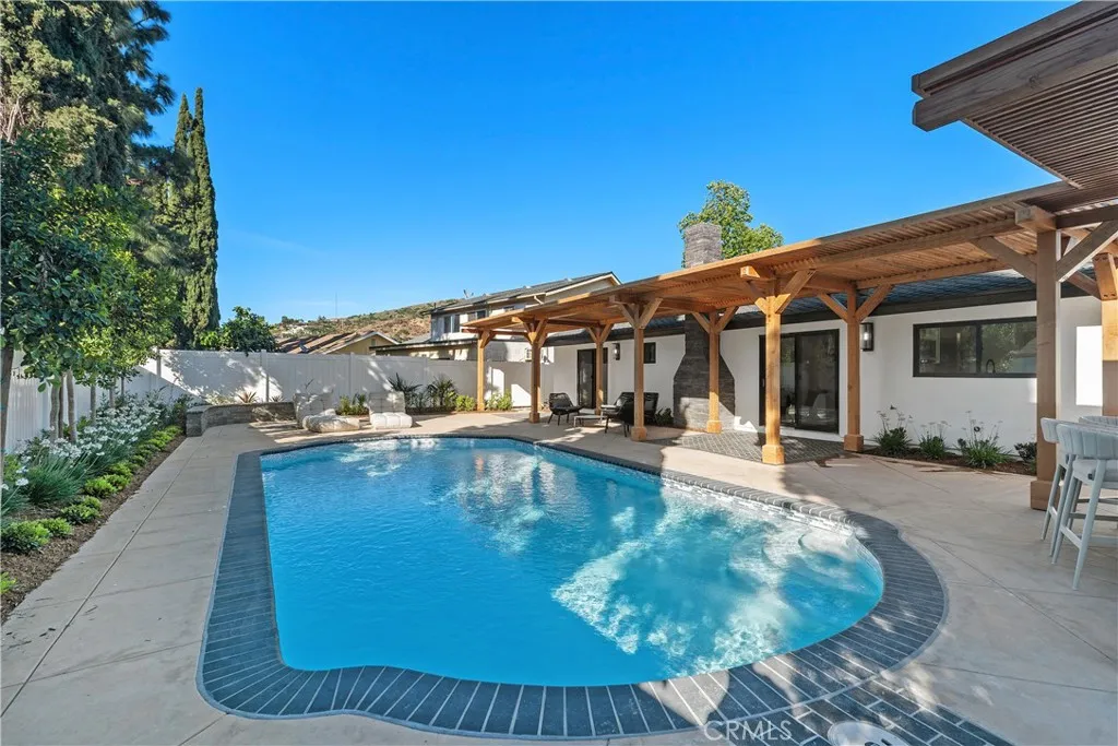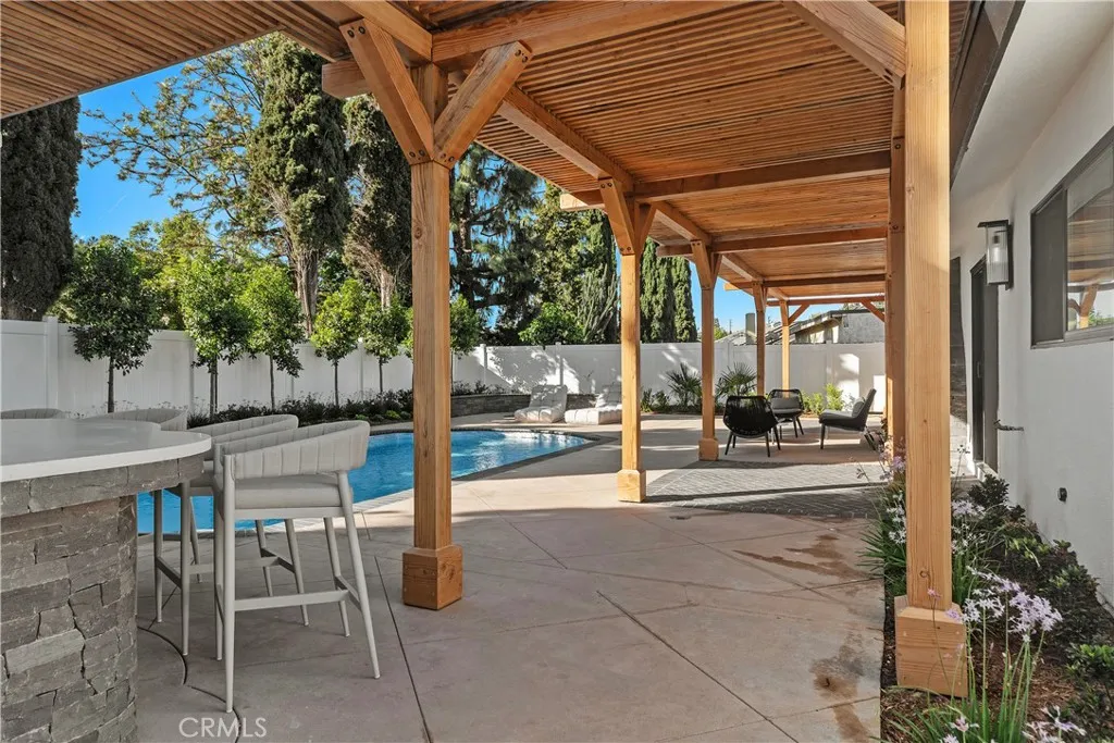 Step into this beautifully reimagined single-level home where style, comfort, and function come together effortlessly. This four-bedroom, two-bath residence welcomes you with warmth and a refined sense of living. The expansive great room features vaulted ceilings, a cozy gas fireplace, and a built-in 60-inch television with soundideal for both relaxing and entertaining. The fully remodeled kitchen stands out with brand-new cabinetry, soft-close doors and drawers, a generous chefs island, and a complete suite of LG appliances, including a natural gas oven and range, refrigerator, dishwasher, and microwave. Enjoy seamless indoor-outdoor living in a backyard designed for both leisure and entertaining. The sparkling pool has been fully updated with new plaster, coping, heater, and a saltwater filtration system. The built-in barbecue center includes a new gas grill, refrigerator, and ample space for gathering. The expansive yard offers a large patio shaded by a pergola, fresh landscaping, and a fully upgraded irrigation systemall enclosed by new fencing for added privacy. The primary suite provides direct pool access and a spa-inspired bathroom featuring a luxurious walk-in shower with multiple showerheads. Extensive upgrades throughout the home include new electrical wiring, plumbing, a tankless water heater, heat pump HVAC system, windows, doors, flooring, casements and moldings, built-ins and LED lighting. A dedicated electronics hub supports modern living with STARLINK internet, whole-home Wi-Fi, a Control4 home automation system, and CAT6 wiring in every room. The finished