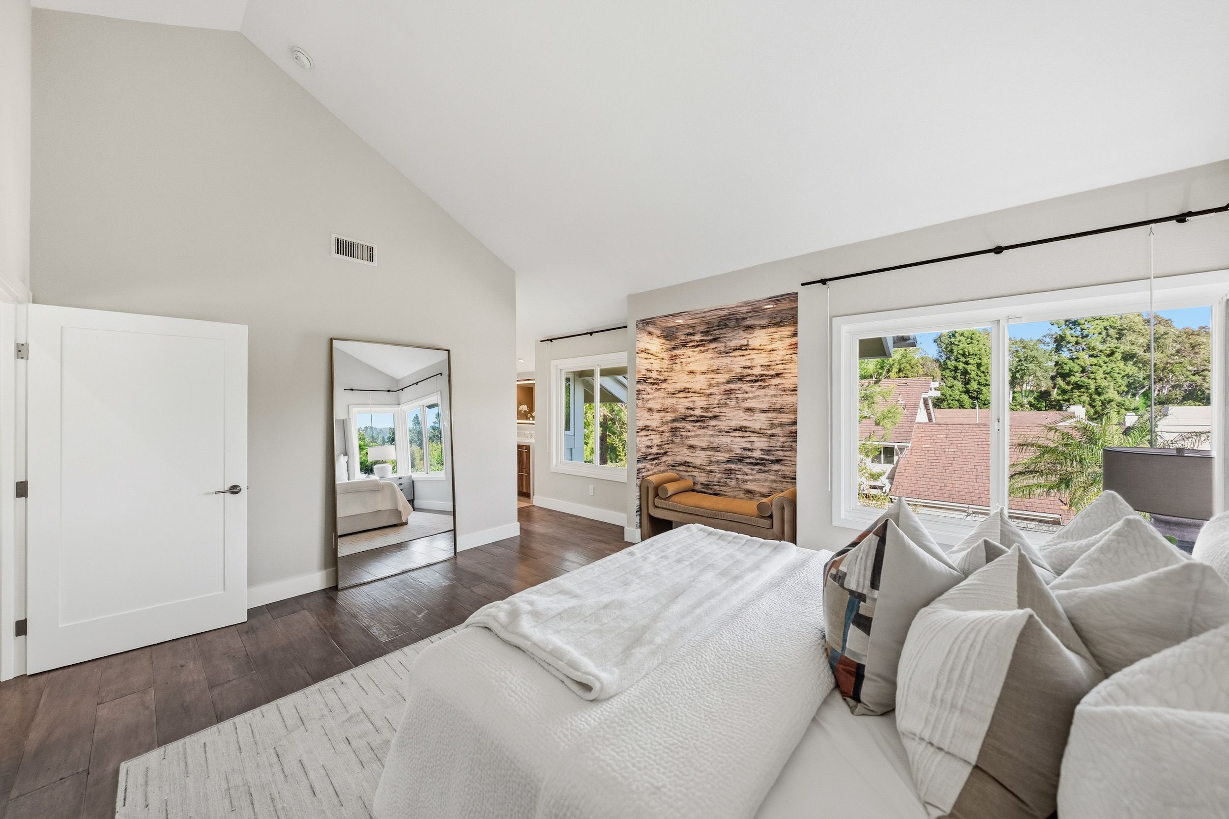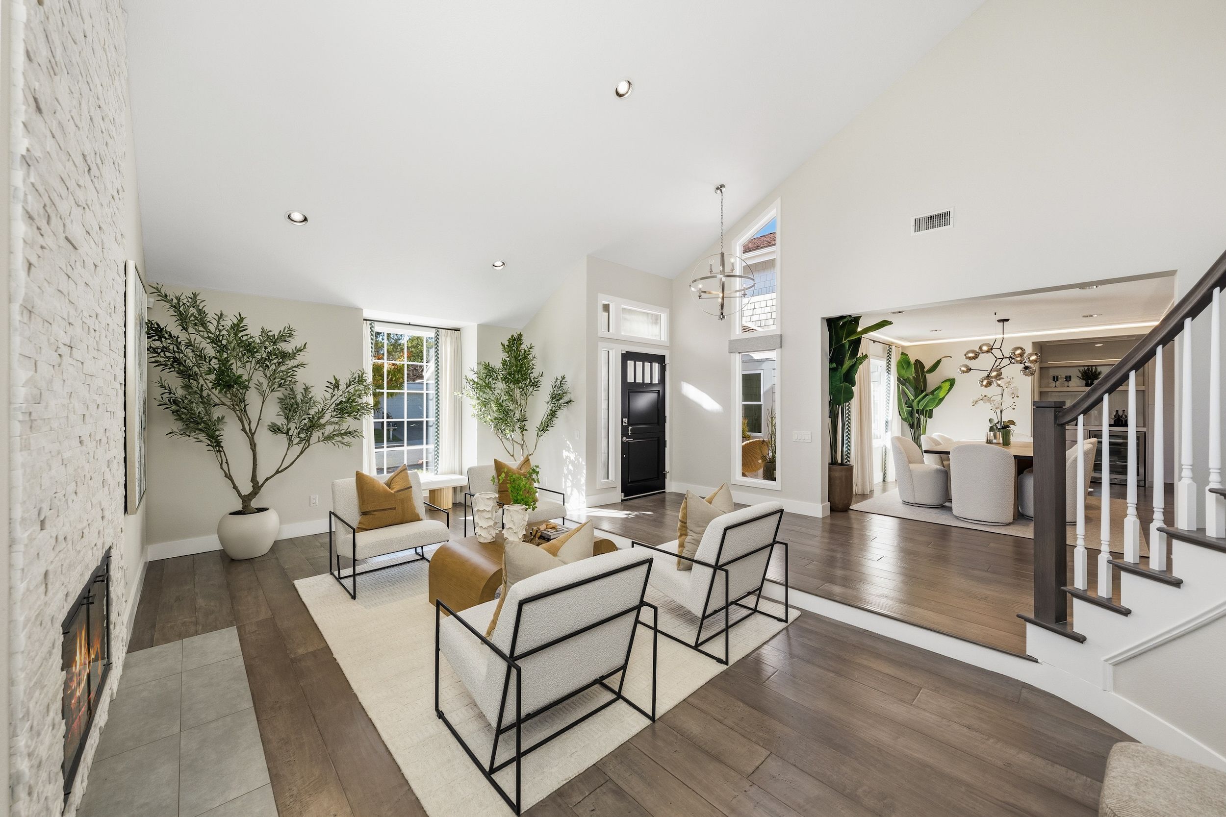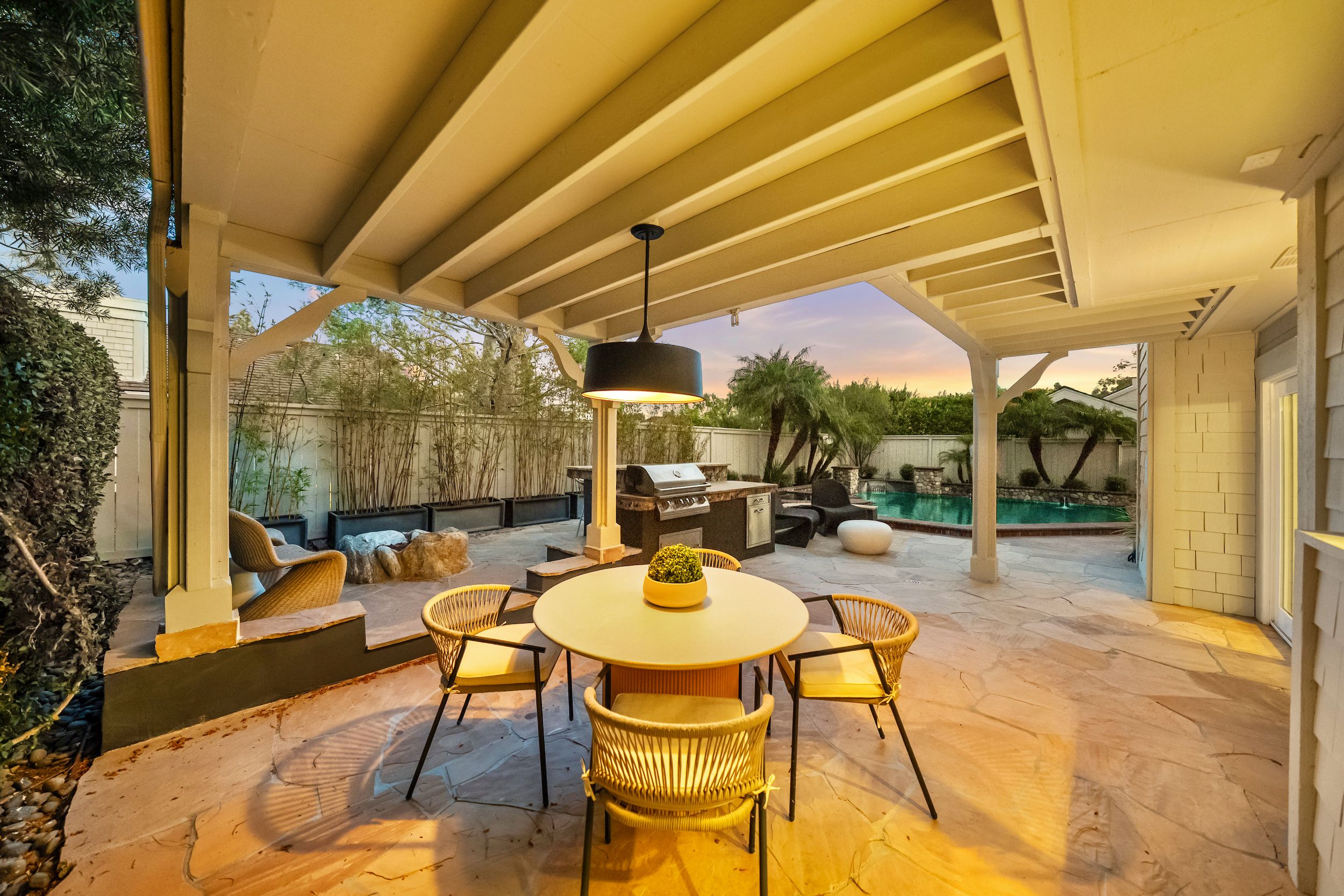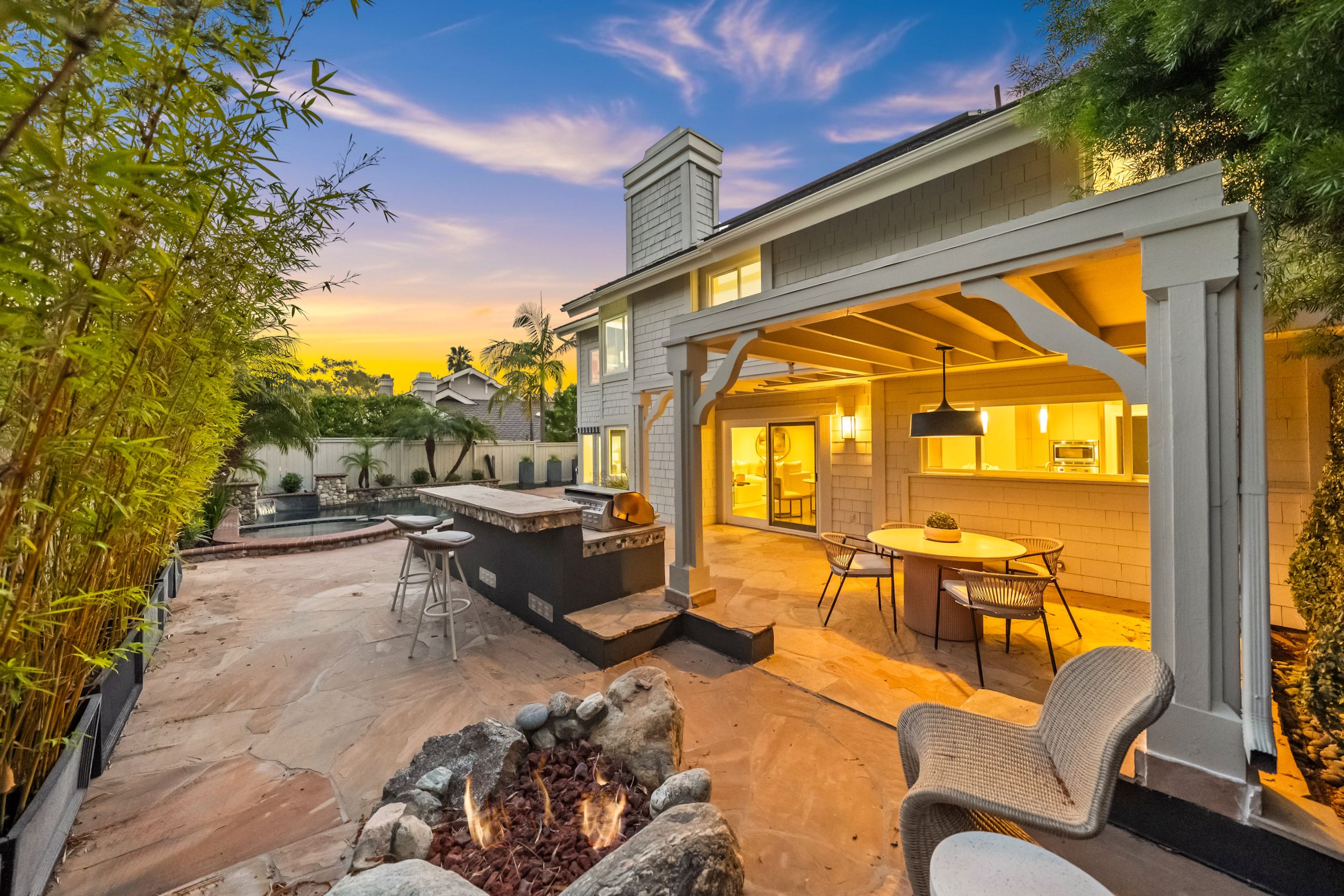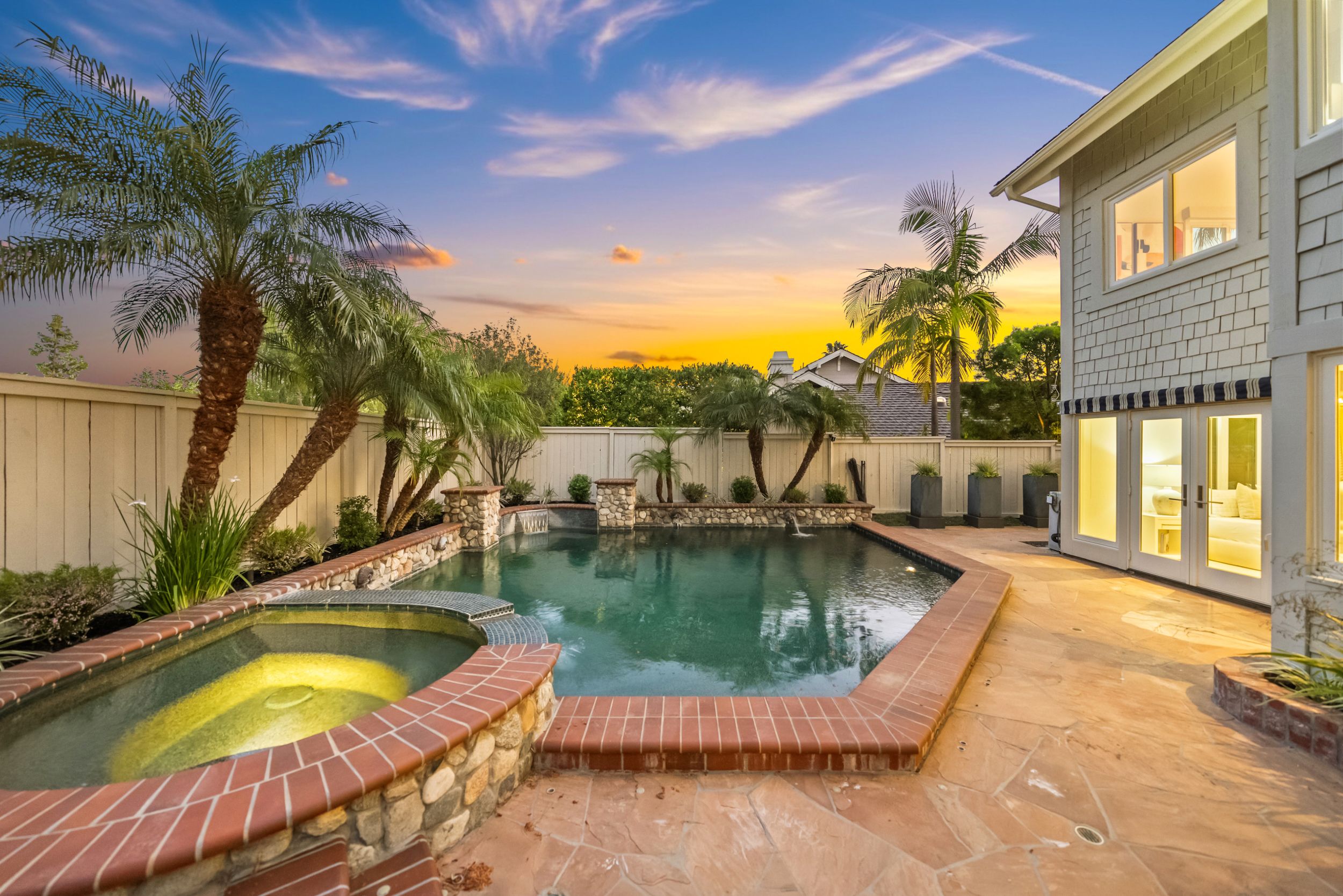 Welcome to this stunning 5-bedroom, 3-bath Orange County retreat where resort-style living meets everyday comfort in one of Irvine's most sought-after neighborhoods. From the moment you step inside, soaring ceilings and sun-drenched living spaces exude warmth and sophisticated contemporary styling throughout this beautifully maintained 3,000 sq. ft. home. The heart of the home is a sleek, well-appointed kitchen featuring quartz counters, custom cabinetry, and a chef-inspired appliance suite — perfect for everything from casual family meals to elegant entertaining. A gracious living room anchored by a stunning ledger stacked stone fireplace flows effortlessly to the dining room, while a convenient downstairs bedroom and full bath offer ideal flexibility for guests or multigenerational living. Wide plank wood flooring, soaring ceilings, solid core doors, 5-inch baseboards, and newly installed energy-efficient windows speak to the quality of finishes found throughout. Upstairs, the spacious primary suite is a true sanctuary, complete with a spa-inspired bath featuring a soaking tub, walk-in shower, dual vanities, and a generous walk-in closet, while three additional bedrooms and a dedicated home office provide space and flexibility for every lifestyle. Step outside to your own private paradise — a breathtaking pool and spa framed by soaring palms, lush tropical landscaping, and elegant stone pillar accents with cascading water features, all flowing seamlessly to a generous covered patio where a pendant-lit dining area and built-in BBQ set the stage for unforgettable gatherings under the Southern California sky. Adding to the home's exceptional value, a fully owned solar panel system paired with a Tesla Powerwall battery delivers energy independence and meaningful utility savings, while a whole-home water filtration system ensures clean, purified water at every tap. Ideally located within walking distance to top-rated Bonita Canyon Elementary and nationally ranked University High School, and just minutes from the 405 and 73 freeways, with very low association dues and no Mello Roos tax, this meticulously maintained home truly represents the best of Orange County living.