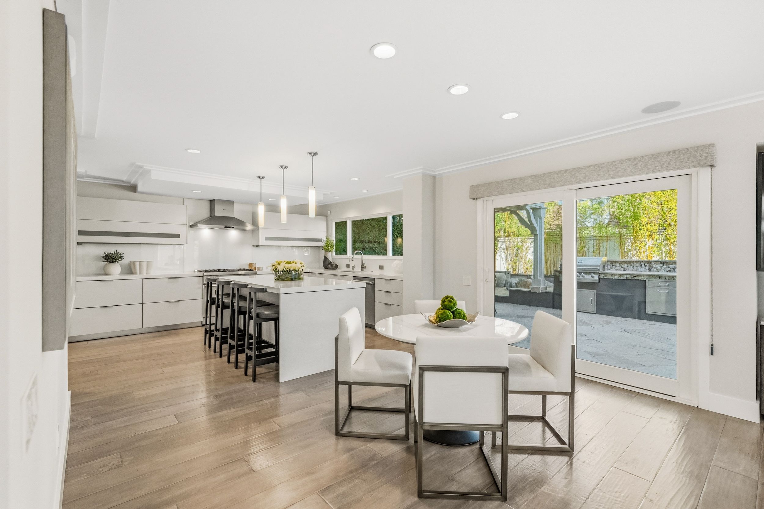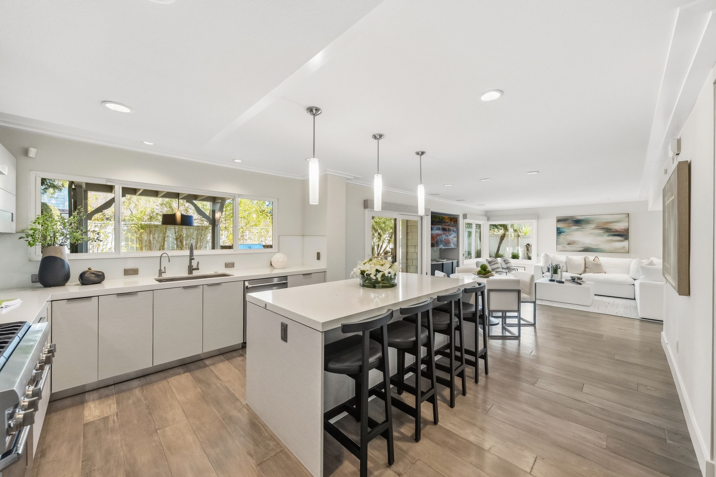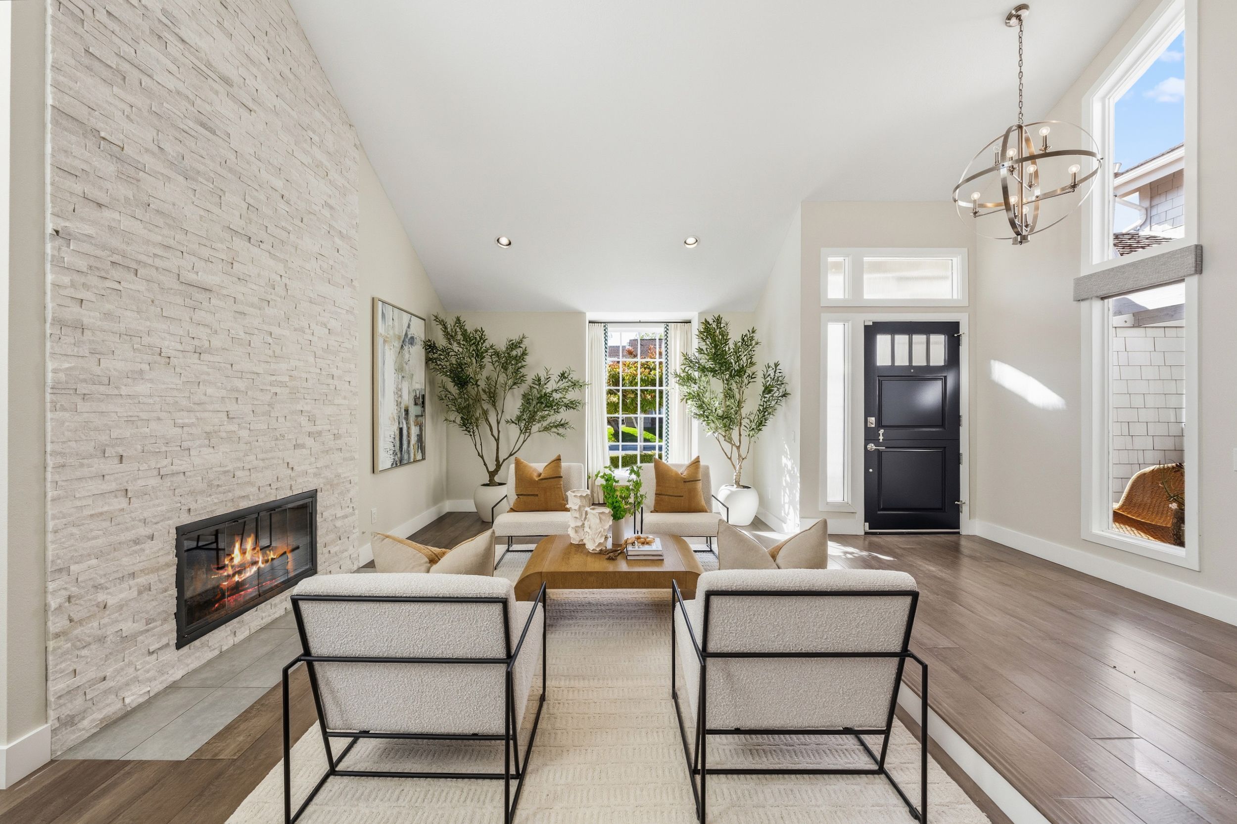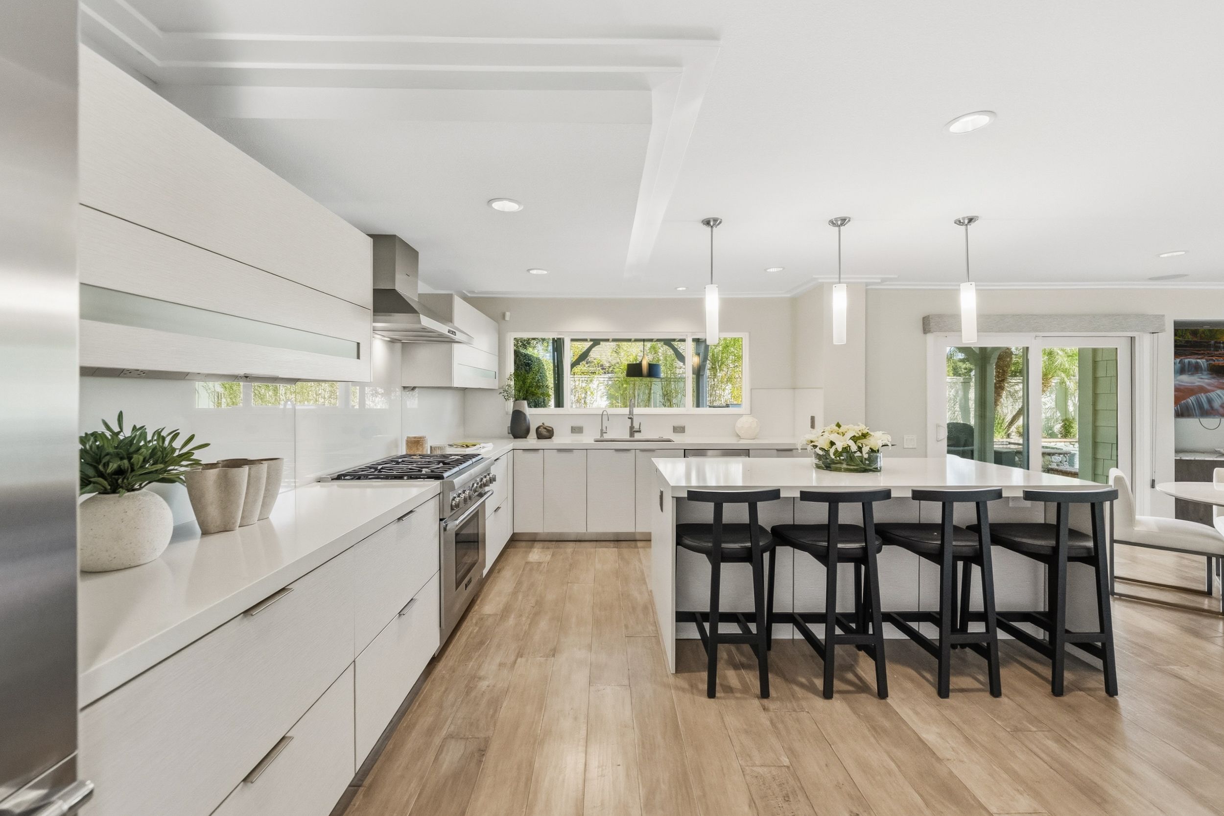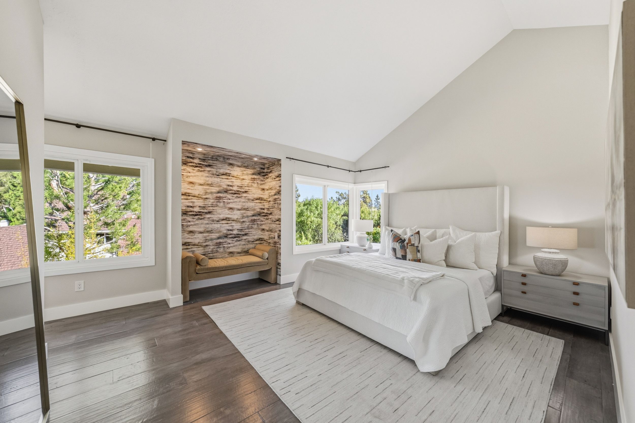 Welcome to this stunning 5-bedroom, 3-bath Orange County retreat where resort-style living meets everyday comfort in one of Irvine's most sought-after neighborhoods. From the moment you step inside, soaring ceilings and sun-drenched living spaces exude warmth and sophisticated contemporary styling throughout this beautifully maintained 3,000 sq. ft. home. The heart of the home is a sleek, well-appointed kitchen featuring quartz counters, custom cabinetry, and a chef-inspired appliance suite — perfect for everything from casual family meals to elegant entertaining. A gracious living room anchored by a stunning ledger stacked stone fireplace flows effortlessly to the dining room, while a convenient downstairs bedroom and full bath offer ideal flexibility for guests or multigenerational living. Wide plank wood flooring, soaring ceilings, solid core doors, 5-inch baseboards, and newly installed energy-efficient windows speak to the quality of finishes found throughout. Upstairs, the spacious primary suite is a true sanctuary, complete with a spa-inspired bath featuring a soaking tub, walk-in shower, dual vanities, and a generous walk-in closet, while three additional bedrooms and a dedicated home office provide space and flexibility for every lifestyle. Step outside to your own private paradise — a breathtaking pool and spa framed by soaring palms, lush tropical landscaping, and elegant stone pillar accents with cascading water features, all flowing seamlessly to a generous covered patio where a pendant-lit dining area and built-in BBQ set the stage for unforgettable gatherings under the Southern California sky. Adding to the home's exceptional value, a fully owned solar panel system paired with a Tesla Powerwall battery delivers energy independence and meaningful utility savings, while a whole-home water filtration system ensures clean, purified water at every tap. Ideally located within walking distance to top-rated Bonita Canyon Elementary and nationally ranked University High School, and just minutes from the 405 and 73 freeways, with very low association dues and no Mello Roos tax, this meticulously maintained home truly represents the best of Orange County living.