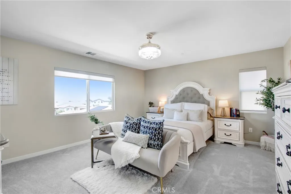 ***REDUCED PRICE! **** Surrounded by serene mountain and valley views, this beautiful pool home is the perfect buy! This 2-story home includes 4 bedrooms, 3 full bathrooms, and a tandem 3 car garage. The open floor plan has been upgraded with waterproof luxury vinyl plank flooring and dimmable recessed lighting. It is great for entertaining! There is 1 guest bedroom and 1 full bathroom on the first floor. The kitchen meets your every need with beautiful quartz countertops, plenty of drawers, and cabinets with upgraded hardware. The large island is remodeled with a large farmhouse sink, utility faucet, filtered water faucet, counter push button garbage disposal, dishwasher, pull out double trash container, and a counter space for bar seating or buffet style serving. Apart from the kitchen you will find a large walk-in pantry, a laundry room and garage entry. The master suite allows for spacious living with a stunning view of the San Bernardino valley. Its large bathroom has Italian marble flooring, separated his and her sinks, soaking bathtub, shower, separate toilet room, a walk-in closet with a window to an amazing mountain view, and a linen closet. The upstairs contains 2 other bedrooms, a bathroom, a large loft, and brand-new carpet through-out. The multi-functional tandem garage is big enough for 3 cars, a home gym, and/or extra storage space. The property is fully landscaped with a variety of greenery and fruit trees that provide shade to dog run. The expanded driveway allows parking for 4 vehicles. The modern, saltwater pool and jacuzzi is completely loaded with a tan