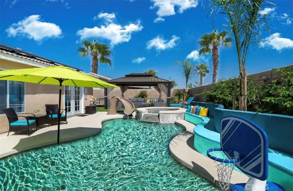 Welcome to this amazing investment opportunity which could also make a lovely primary or secondary home! Single level turnkey Tuscan-style fully furnished and equipped house offers 4 bedrooms, 3 renovated baths, spacious open-floor plan with great room, family room and dining area, beautiful resort-style backyard features lagoon-style pebble pool, jacuzzi, waterslide, concrete built-in oversized bench, Sauna Booth, artificial grass area with kids Playground structure and shaded Gazebo pergola. Currently an active short-term rental with NO HOA`s, this vacation rental is ready for the savvy investor looking to generate passive income with all of the amenities to attract festivalgoers and vacationers year-round! Minutes away from Coachella and Stagecoach Fairground, less than 10 minutes to PGA West, 30 minutes to Palm Springs and 1-hour to Joshua Tree. All furniture and appliances are included, featuring washer & dryer, dishwasher, oven-range and fridge. Leased Solar system to help you save on your electricity bills, smart- remotely controlled pool system with new equipment and smart door lock with Ring doorbell.