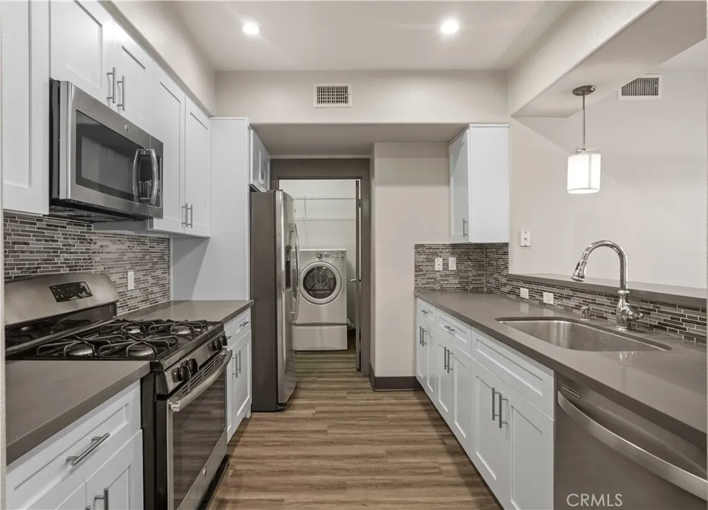 Craving a peaceful tree-lined view while mere moments from city conveniences? This remarkable 2-bedroom, 2-bath townhome in the Rose Arbor Condominiums complex blends an elevated lifestyle with scenic tranquility in Valencia! Resting along a quiet pathway in a rear-unit location, enjoy a sense of privacy and your own leafy prospects of the Paseos. Inside, soft natural light pours through wide windows across wood-style floors, crisp white walls, and recessed lighting. Its open-concept layout flows from the living roomanchored by a fireplace and built-insto the dining area and through to the kitchen, where stainless steel appliances, tiled countertops, and ample cabinetry make cooking feel effortless. Slide open the glass doors to your well-sized patio, perfect for a relaxed brunch or a breezy evening BBQ. Upstairs, the primary suite offers treetop vistas and an ensuite featuring a dual-sink vanity and a shower/tub combo. A second bedroom and full hall bath complete the upper level. Additional perks include an attached 1-car garage with a laundry corner, plus access to the community pool, spa, and picturesque Valencia Paseo trails just beyond your door. Near award-winning schools, restaurants, Bridgeport Park, and shopping, along with proximity to the I-5, this home invites you to experience suburban calm with urban benefits. Come see how this amazing abode could signal the start of your new chapter!