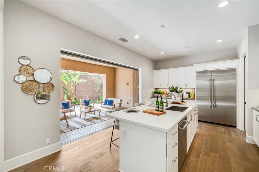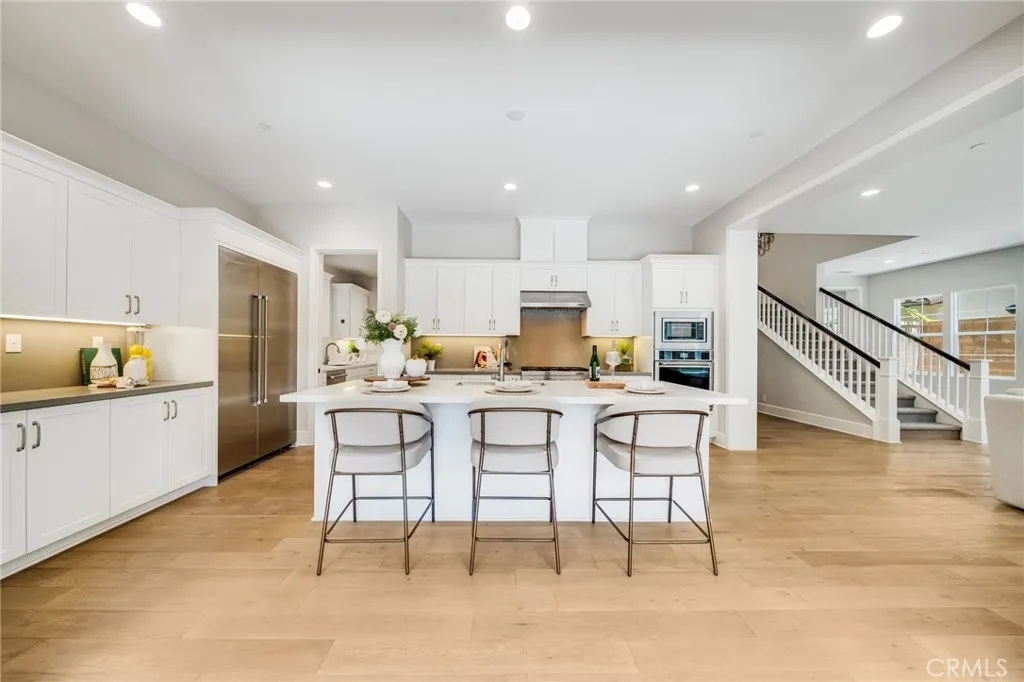 This elegant residence is located in the sought-after Eastwood Village community of Irvine and showcases tasteful upgrades with a spacious, functional layout. The home features a desirable downstairs guest suite with a private en-suite bathroom and walk-in closet, ideal for multigenerational living. The main kitchen offers an oversized center island, built-in double-door refrigerator, stainless steel appliances, 6-burner cooktop, large walk-in pantry, and a separate chefs kitchen for added flexibility. Beautiful wood flooring spans the main level, while the upper floor is enhanced with upgraded plush carpeting. A versatile loft provides additional space that can serve as a media room, office, or play area. The luxurious primary suite is situated upstairs with scenic views and includes a spa-inspired bathroom with a soaking tub, walk-in shower, and custom-designed walk-in closet. A recently added California room extends the living space outdoors for year-round enjoyment. Residents of Eastwood Village enjoy resort-style amenities including pools, clubhouses, BBQ areas, tennis and basketball courts, soccer fields, playgrounds, and the scenic Jeffrey Open Space Trail. Conveniently located near shopping, highly regarded schools, and major freeways, this home offers the perfect blend of luxury, comfort, and convenience.
