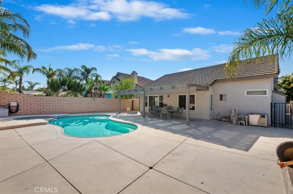 Welcome to Orangecrest! This Beautiful SINGLE STORY 3 bedroom, 2 Bath 1557sf POOL Home is the perfect find! Ideally located between Top Rated Elementary, Middle and High Schools in the Award Winning RUSD. Close Freeway Access and Walking distance to Schools and Orange Terrace Park with a Community Center, Year round Sports fields, Jogging path and Library. Entering the Home you will be greeted by tons of Natural Light and an open Concept Living Room with a cozy Fireplace and Tiled Dining Room. Continue through to the Upgraded Kitchen with ALL Included Stainless Steel Appliances, XL sink and an attached Kitchen Island saving a seat for many and open to the Family Room for everyone to be included. Down the hall you will find a Full Restroom with Tub/shower Combo, Laundry Room with INCLUDED Washer and Dryer, Hallway Cabinet nook for Storage, 2 matching Bedrooms with Ceiling Fans and a Primary Suite with a BIG Walk In Closet! Primary Restroom has a Soaking tub, Private toilet room and a long Mirrored Dual sink Vanity. A huge plus is the Primary bath exit to pool area for convenient Bathroom trips from the pool and Jacuzzi. This Backyard will set the stage for many memorable moments with a Bogner Built Sparkling Pool & Jacuzzi, a Huge Patio Cover and endless Concreted Pool decking surrounded by block wall for Privacy of all of the fun to be made. Don't miss the 2 Custom built Storage sheds along the side of the house. With NEW Exterior Paint, New front lawn and sprinkler valves, Newer AC & Furnace, Rebuilt Pentair Pool Equipment, Upgraded Kitchen, NO HOA, & LOW TAX you will not
