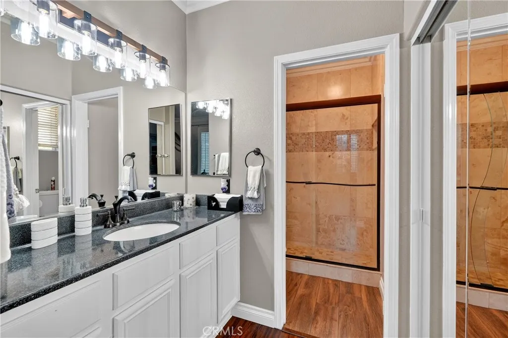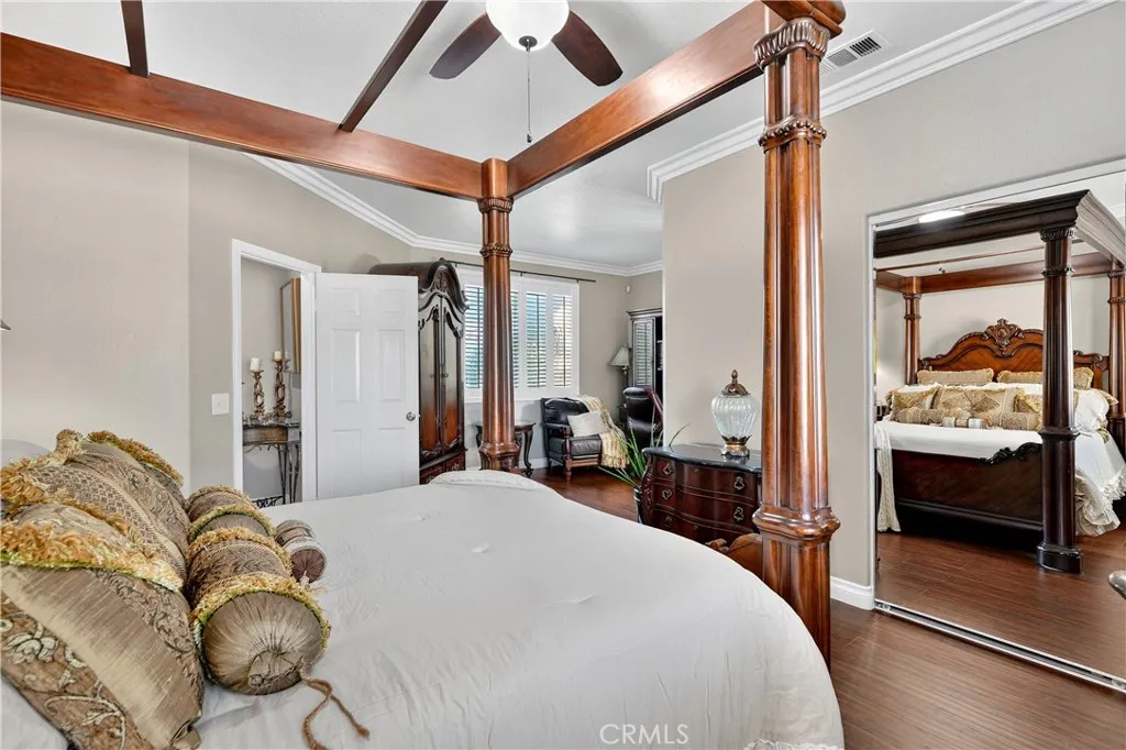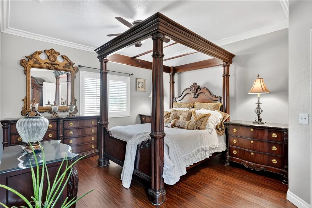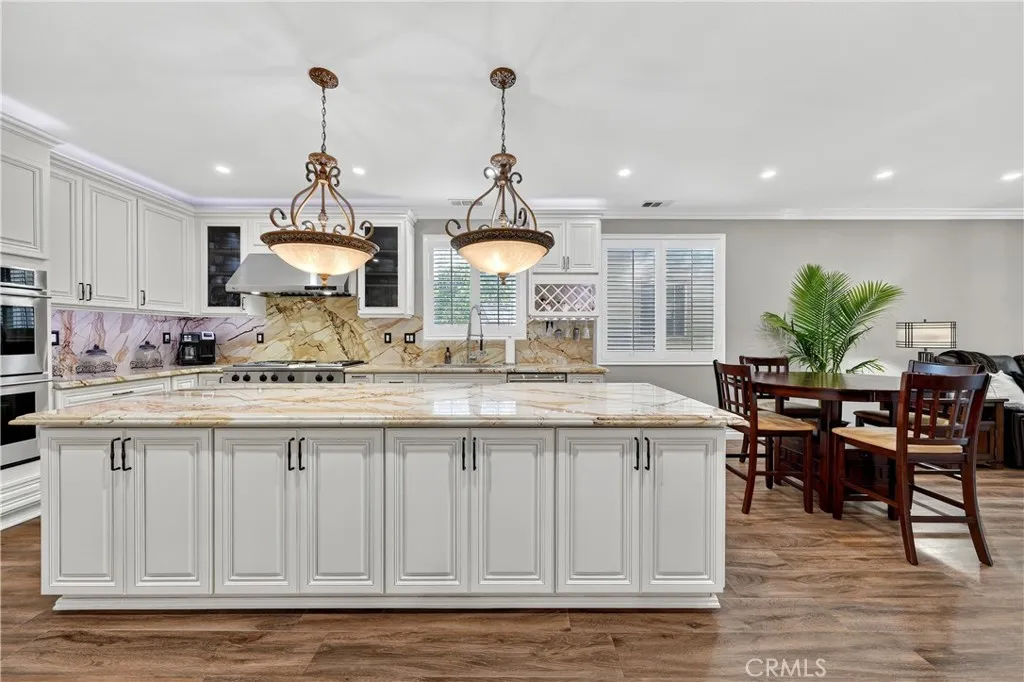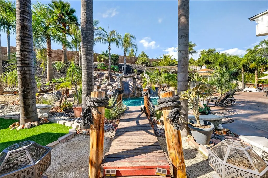 Your dream home awaits! This stunning property truly has it allfeaturing a breathtaking backyard that offers resort-style living at its finest. Enjoy a beach-entry, saltwater pool and spa complete with a waterfall grotto and slide. The expansive larger lot offers 16,000+ sq ft and includes custom stamped concrete, a built-in gas fireplace with a cozy seating area, a beautiful gazebo, and a custom BBQ island with a built-in fridge, sink, pergola, and patio cover. With no rear neighbors and a private cul-de-sac location, the setting is truly unbeatable. Inside, the home is filled with upgrades. A formal living room welcomes you at entry. The layout offers seven bedrooms, or six plus a loftwith two bedrooms conveniently located downstairs. Two of the bedrooms are en-suites with their own private attached baths. The primary suite features double-door entry, a spacious walk-in closet, dual sinks, separate bathtub and walk-in shower. Upgraded restrooms. The gourmet kitchen is a chefs dream with an oversized 10-ft island with pendant lighting, self-closing antique-white cabinetry, commercial-grade stainless steel GE Monogram appliances, 6 burner- 48" stove with griddle. Quartzite counters and backsplash, convectional double wall ovens, convectional built in microwave/toaster oven, and an apron sink. Storage is abundant with a walk in pantry, a built-in wine rack, spice drawer, cutting board, lazy susan, and a hidden cabinet for trash bins. The kitchen opens to the family room with a double-sided fireplace and also offers a separate dining room. Shutters, crown moulding and LVP woo