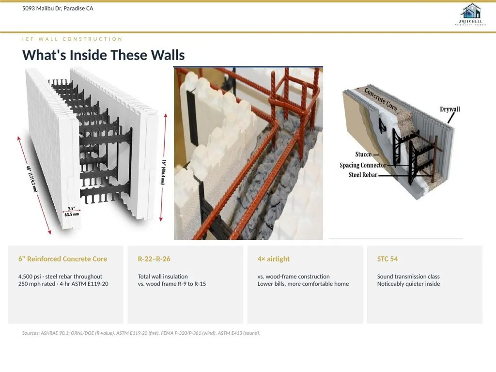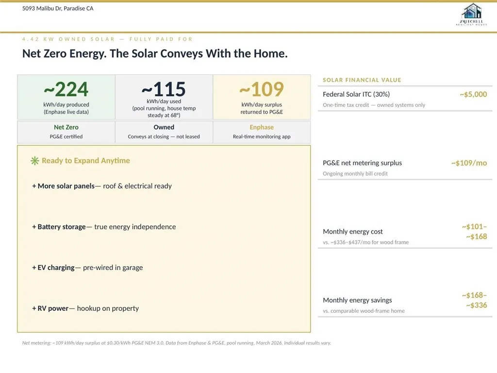 Forever Home. Built with Intention. Designed for Life. Designed as a true forever home, this 3,358 square foot custom residence combines structural integrity, energy efficiency, and refined comfort in one thoughtfully executed design. Constructed with Insulated Concrete Form (ICF) technology, the exterior walls consist of 6-inch steel-reinforced concrete flanked by over 5 inches of continuous insulation, delivering exceptional durability, fire resistance, and thermal performance. This PG&E Zero Net Energy qualified home is powered by owned solar, contributing to reduced utility costs. Insurance options available through Farmers Insurance reflect the strength of this construction method. Located in lower East Paradise, this 4-bedroom, 3-bath layout blends resilience with modern design. High ceilings, exposed wood beam accents, and black dual-pane Milgard windows bring natural light throughout. The great room is anchored by a fireplace and opens seamlessly to outdoor living through expansive sliding glass doors. The kitchen is designed for everyday function and entertaining, featuring shaker cabinetry with pull-out drawers, quartz countertops with full-height backsplash, induction range with convection oven, vent hood, walk-in pantry, and an oversized island with prep sink. Bamboo hardwood flooring runs throughout the main living areas and bedrooms, each bedroom thoughtfully appointed with its own ceiling fan. The primary suite includes vaulted ceilings, fireplace, patio access, a spacious walk-in closet, and a spa-inspired bath with dual vanities, soaking tub, and oversized