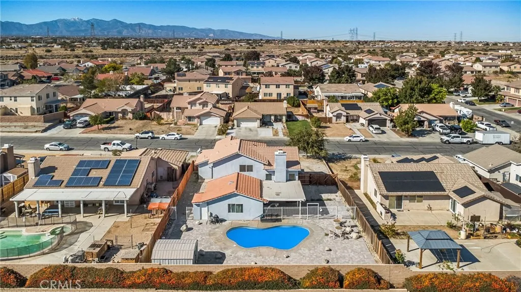 Welcome to this beautifully maintained 5-bedroom, 3-bathroom pool home located in a desirable Hesperia neighborhood! With over 2,100 sq. ft. of living space on a 9,400+ sq. ft. lot, this home offers the perfect blend of comfort, style, and function. Step inside to a formal entryway leading to spacious living and dining areas filled with natural light. The open floor plan is ideal for family living and entertaining, with a comfortable flow between the kitchen, dining area, and family room. Enjoy the privacy of a downstairs bedroom and bath, perfect for guests or a home office. Upstairs, the primary suite features ample space, a private bath, and great views. Outside, enjoy your own backyard oasis complete with a sparkling pool and covered patioperfect for barbecues, gatherings, and relaxing in the desert sun. The low-maintenance landscaping and driveway with attached 2-car garage make this home as practical as it is beautiful. Conveniently located just minutes from the freeway, close to shopping, schools, parks, and dining, this home offers everything you need for comfortable living in Hesperia. No HOA No Mello-Roos