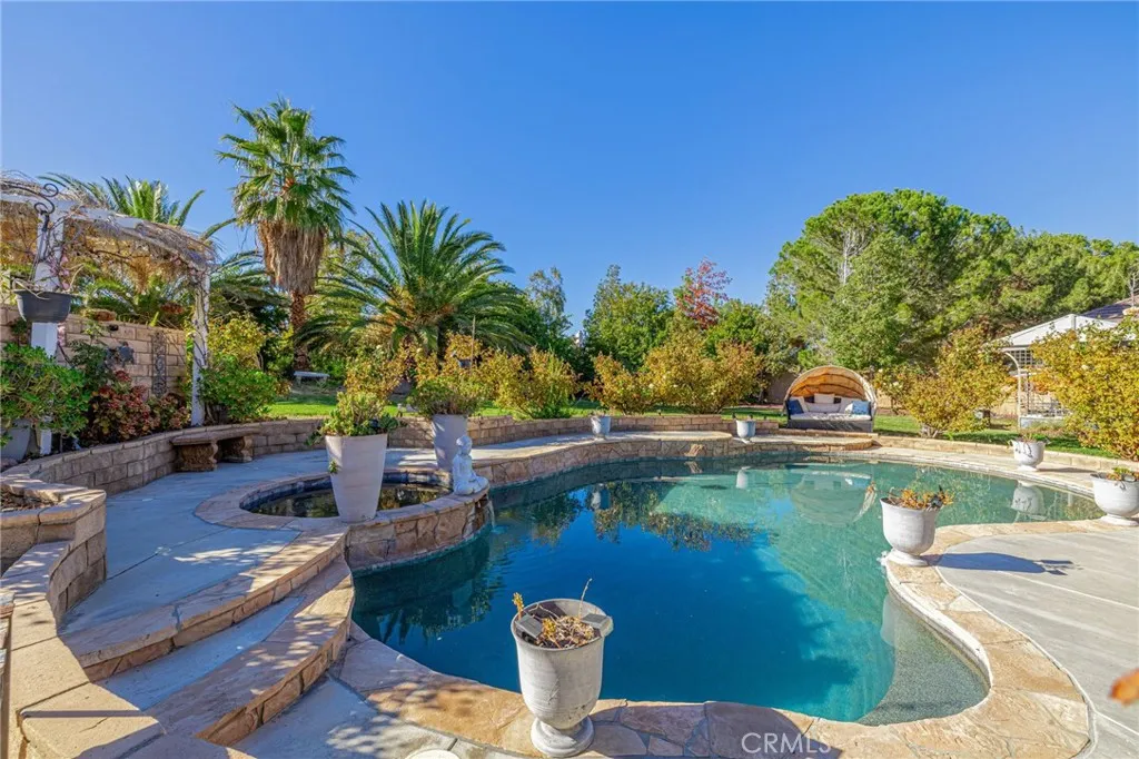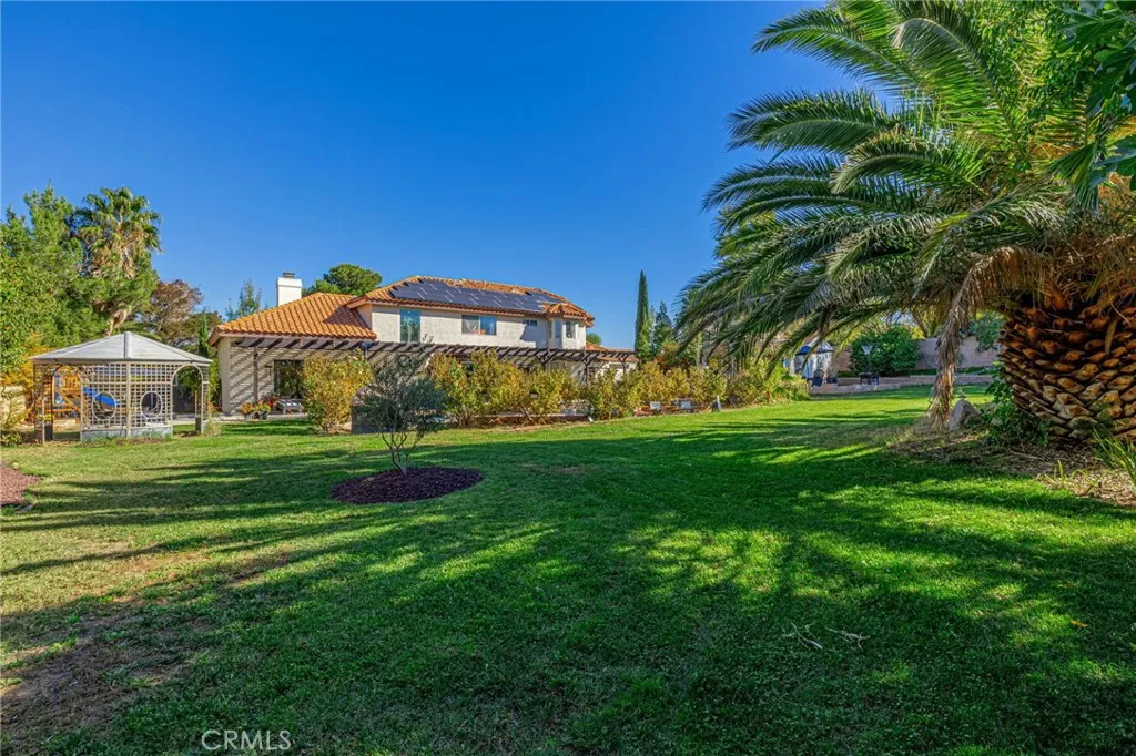 Welcome to a residence where elegance, efficiency, and entertainment unite in one stunning property. Nestled in the prestigious West Palmdale/Quartz Hill area, this luxury estate offers 4 bedrooms, 3 full baths, and 3,218 sq. ft. of refined living space, plus an additional 200 sq. ft. office/flex room not included in the total. Office upstairs can double as 5th bedroom(by adding a closet), provides versatile options for work or leisure. Set on a beautifully landscaped 21,212 sq. ft. lot, this home is designed for resort-style living. Enjoy a Pebble Tec pool and spa, 8-person sauna, covered patio, and multiple outdoor spaces for dining, games, and relaxation under breathtaking sunsets. 46 owned solar panels with two backup batteries, Tesla app integration, and a smart thermostat system for HVAC and irrigation ensure modern energy efficiency and comfort. Through elegant double doors, you're greeted by a grand staircase, chandelier, and bright open floor plan. The formal living (with sliding doors to the backyard) and dining rooms, feature engineered plank flooring, and exquisite architectural details throughout. A downstairs guest suite with nearby full bath offers privacy and flexibility. The primary retreat features a cozy fireplace in the blt-in cabinet (which stays), spa-inspired bath with soaking tub, separate shower, and dual sinks. Upstairs includes additional bedrooms plus a flex space perfect for an office or studio. The gourmet kitchen includes newer stainless appliances (refrigerator incl.), and the laundry room has a built-in desk. A two-car garage provides ample