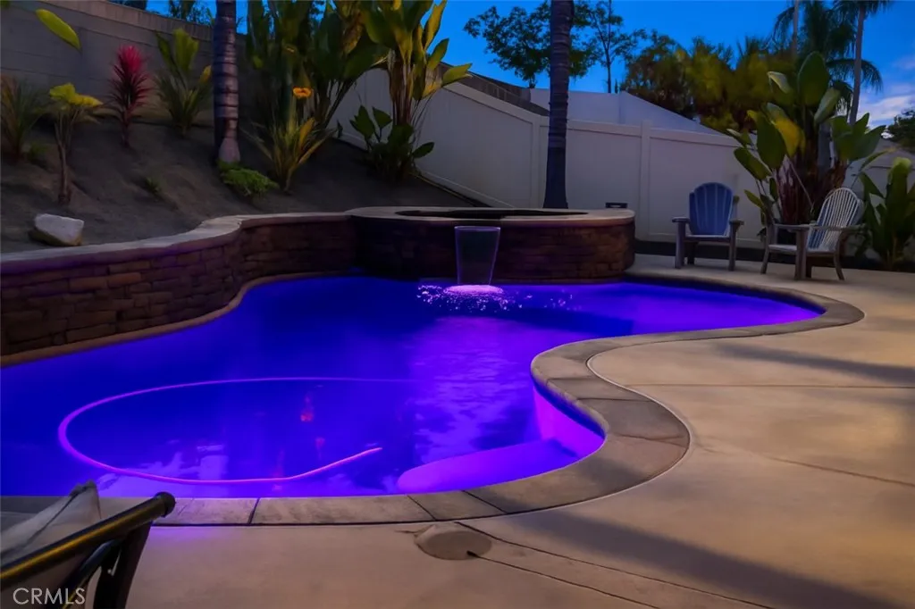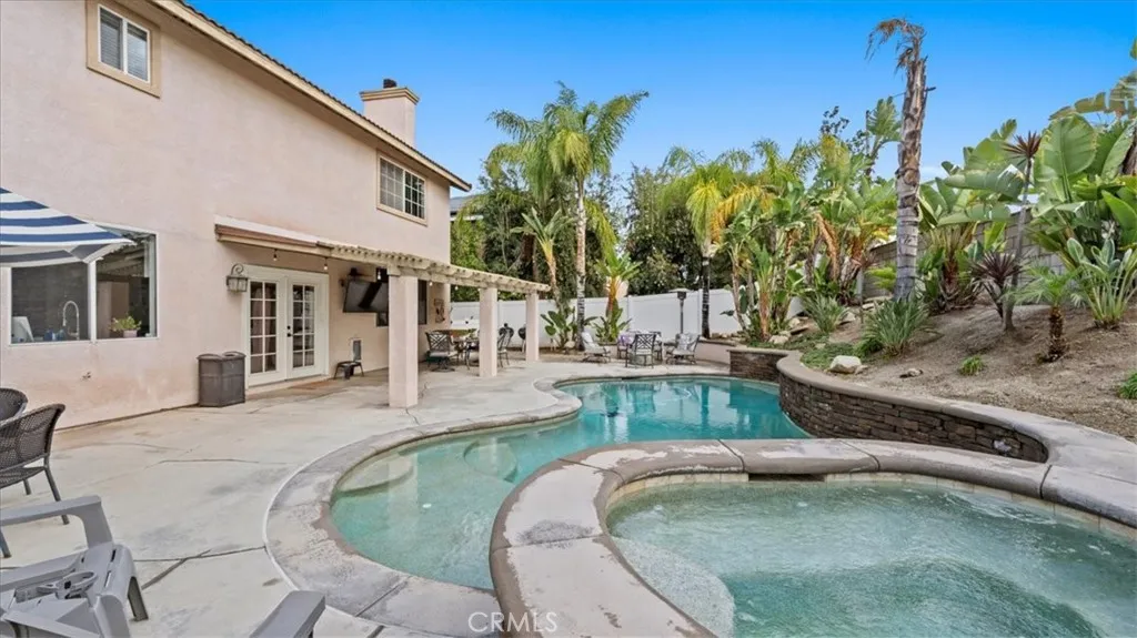 Is there a 4-bed home in Riverside with a pool, 3-car garage, and no HOA? In the heart of Orangecrest, this thoughtfully upgraded residence offers over 2,600 square feet of elegant living on a quiet, tree-lined street in the 92508 zip. A custom pebble-tech pool, designer kitchen, and flexible layout create a refined blend of sophistication and everyday comfort. Step inside to find wide-plank luxury vinyl flooring and detailed crown moulding throughout. The spacious kitchen features white shaker cabinets, quartz countertops, a charcoal-toned island, and a striking tile accent wall behind the gas range and stainless chimney hood. A large stainless farmhouse sink sits beneath a picture window with views of the private backyard. Enjoy open flow between the kitchen, dining, family, and living roomsperfect for both daily living and entertaining. The main level includes a full bedroom (currently used as an office) and bath, ideal for guests or multi-generational living. Upstairs, youll find three additional bedrooms, including a generous primary suite with dual sinks, his-and-hers walk-in closets, a soaking jacuzzi tub, and a separate shower. Out back, unwind in your own resort-style oasis: a custom in-ground pebble-tech pool with raised spa, stacked-stone spillway, and mature tropical landscaping including palms and birds of paradise. The backyard also features an extended concrete patio, full vinyl fencing, a retaining wall, and an irrigation system for low-maintenance enjoyment. Additional upgrades include an upgraded 17 SEER HVAC system with heat pump, new returns throughout t