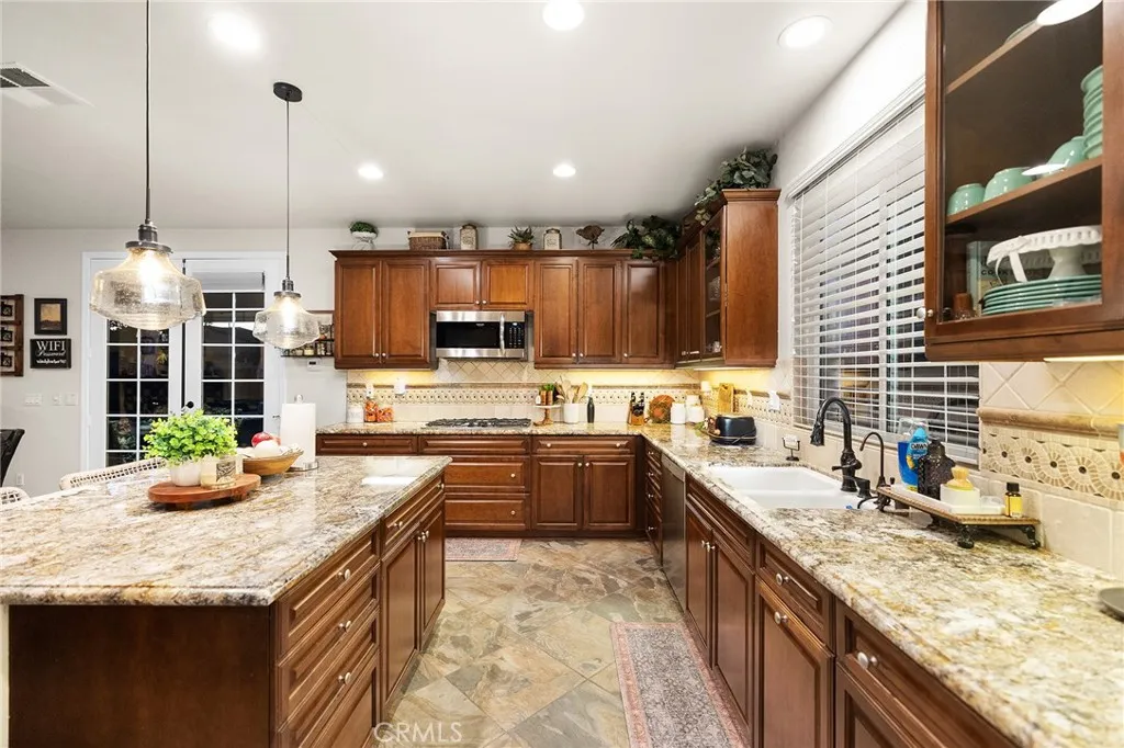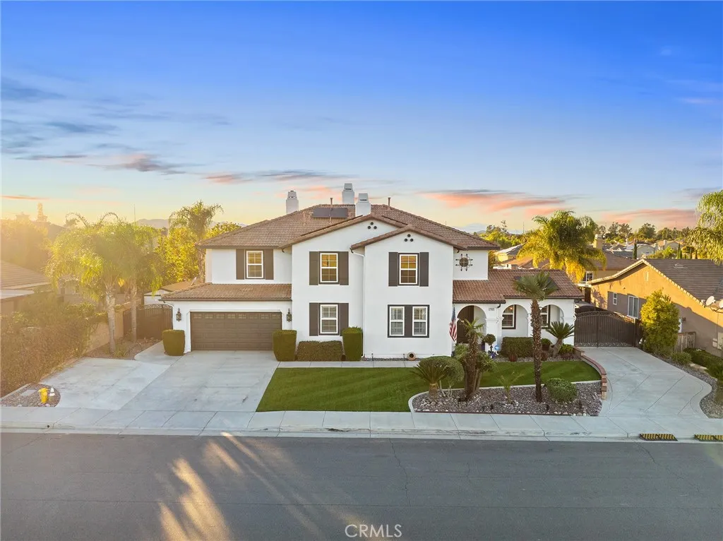 This is the unicorn property you've been waiting for a spectacular move-in ready 5-bedroom, 4-bathroom pool and spa estate with RV parking on a generous nearly 11,000 square foot lot with NO HOA! Sprawling across nearly 4,000 square feet of luxurious living space, this exceptional home features a highly versatile floor plan perfect for comfortable multigenerational living with one oversized bedroom and full bathroom downstairs, plus a den/office that could easily be converted to a 6th bedroom. Freshly painted inside and out, enter through a grand foyer with soaring vaulted ceilings flanked by an elegant formal dining room and a stunning formal living room with cozy fireplace, currently being used as an office. The gourmet kitchen showcases beautiful rich wood cabinetry, convenient double ovens, gas cooktop, an oversized island with gorgeous decorative backsplash, functional butler's pantry with mini fridge and sink, plus a nice-sized pantry, all overlooking the expansive family room featuring a recently remodeled designer fireplace. A dramatic sweeping staircase with striking wrought iron balusters leads to three additional generously sized bedrooms upstairs, one of which is an ensuite with full bathroom, plus another full bathroom and the magnificent primary suite. The luxurious primary suite boasts a huge attached flex/sitting room with convenient wet bar and mini fridge, complemented by a stunning dual-sided fireplace shared between the serene bedroom and versatile sitting area. The spa-like primary bath offers a spacious separate shower, relaxing soaking tub, elegant d