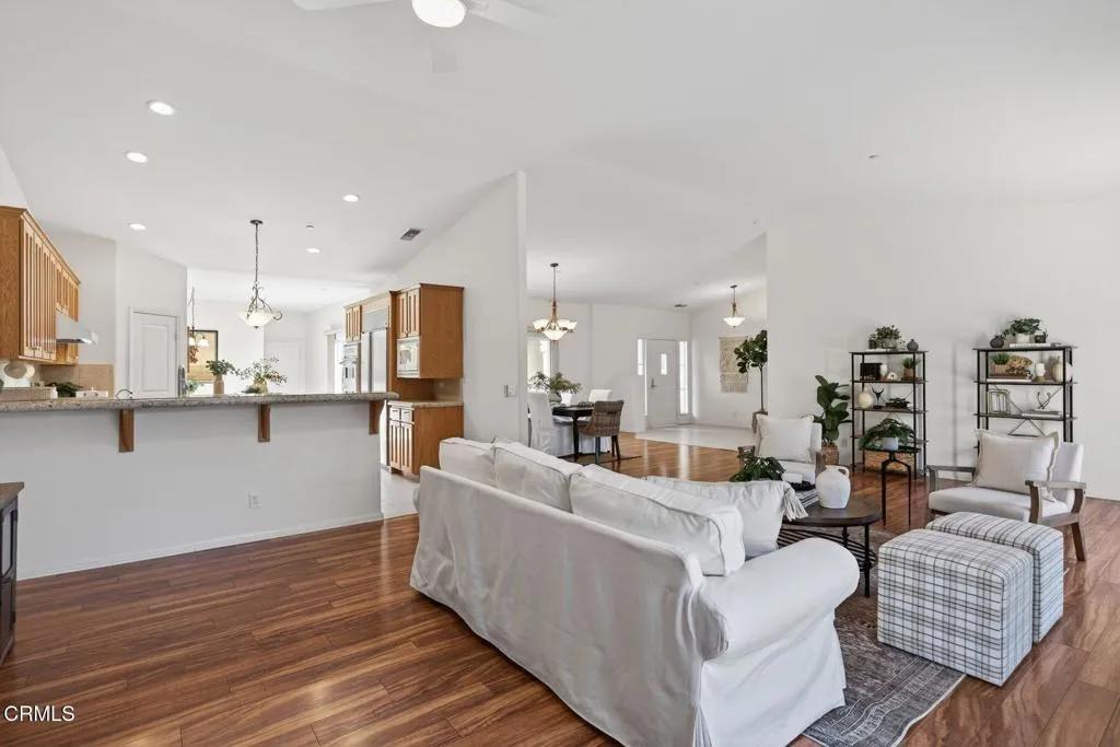 Rare Single-Story Home in Ventura's Coveted Presidential Estates - Welcome to this lovingly maintained one-story residence built in 2000 and offering an expansive 2,410 sq. ft. This spacious 3-bedroom, 3-bath home seamlessly blends comfort, style, and effortless indoor-outdoor living. A charming private front courtyard, complete with mature Plumeria trees, sets the tone--a perfect spot for your morning coffee or a remote work break. Step inside to a light-filled living area featuring a cozy fireplace, tall ceilings, luxury vinyl plank flooring, and recessed lighting. Multiple sliding doors open to the landscaped yards, creating a wonderful flow for entertaining and bringing the outdoors in. The open-concept layout includes an inviting dining space overlooking the courtyard. Designed for the home chef, this special kitchen boasts Viking Professional double self-cleaning convection ovens, a Viking 6-burner gas range with hood, a built-in SUB-ZERO refrigerator, and a Kenmore stainless steel dishwasher. Additional highlights include a walk-in pantry, center island, eat-in bar, abundant cabinetry, a built-in desk, and a charming breakfast nook with courtyard views and direct patio access. The primary suite is a peaceful retreat with its own slider door to the backyard, a generous walk-in closet, and a spacious bath offering dual sinks, a soaking tub and separate shower. Two additional guest bedrooms feature mirrored closet doors and share a Jack and Jill bath with dual sinks. A third full bath adds extra flexibility for guests. A dedicated laundry room with plentiful storage and
