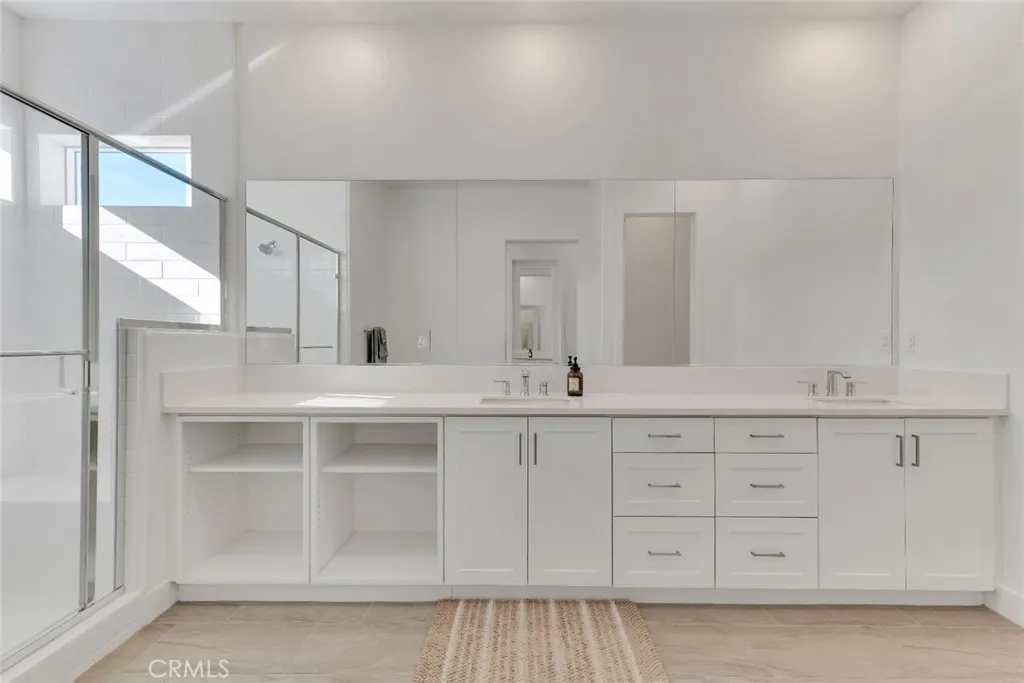 Set within the newly built Peak at Valencia enclave in the FivePoint Valencia neighborhood, this tri-level, light-filled, 4-bed, 3.5-bath, 2,843 sq ft contemporary residence showcases the appeal of modern new construction paired with unobstructed hillside views and a vibrant, amenity-rich community. The entry opens to a great-room style living space defined by high ceilings, recessed lighting, crisp finishes, and expansive windows that flood the home with natural light, while a textured wood accent wall adds warmth and architectural interest. The living, dining, and kitchen areas flow seamlessly together, with the dining space framed by floor-to-ceiling windows and the kitchen featuring an all-white palette, wide central island with seating for four, white shaker cabinetry, under-cabinet lighting, contemporary hardware, and built-in stainless-steel appliances. A main-level bedroom and full bath provide flexibility for guests or a home office. Upstairs, the spacious primary suite offers a private deck with contemporary railings and sweeping views of the surrounding hills, a generous walk-in closet, and a luxurious en-suite bath with dual-sink vanity, tile floors, and a glass-enclosed shower. 2 additional good-sized bedrooms share a full hall bath while a convenient laundry room completes the level. The upper living room serves as a versatile bonus area with bar, beverage refrigerator, and wine storage, and a convenient powder bath is ideal for a family room, office, studio, or play space, and opens through sliding glass doors to a California room/upper deck designed to maxim