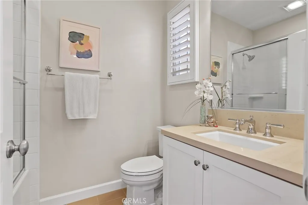 Discover this stunning four-bedroom, four FULL bathroom home with a spacious loft, ideally located on a rare corner lot with an extended driveway that adds both privacy and curb appeal. Bright and inviting, the living room features large windows, recessed lighting, elegant crown molding, and sleek tile flooring. Perfect for relaxing or entertaining, it flows seamlessly into the open-concept layout. The kitchen boasts a spacious granite island with bar seating, stainless steel appliances, walk in pantry, and sleek white cabinetry with glass uppers and a modern mosaic backsplashboth stylish and functional. Just off the kitchen, the dining area is filled with natural light from sliding glass doors that open to the lush backyard, creating an ideal space for casual meals or hosting guests. The expansive and well-designed floorplan includes a convenient first-floor bedroom or office with an adjacent full bathperfect for guests or a dedicated workspace. Upstairs, youll find three generously sized bedrooms, each with its own private bathroom, offering comfort and flexibility for every member of the household. A flexible loft can be used as a media room, play area, or cozy second living space. Retreat to the luxurious master suite, complete with dual sinks, a soaking tub, and a separate walk-in shower. Additional highlights include energy efficient solar panels and Tesla battery that are COMPLETELY PAID OFF and custom built in garage cabinets. Enjoy outdoor living in the private, beautifully landscaped backyard featuring a spacious California Room with ceiling fan, perfect for dinin