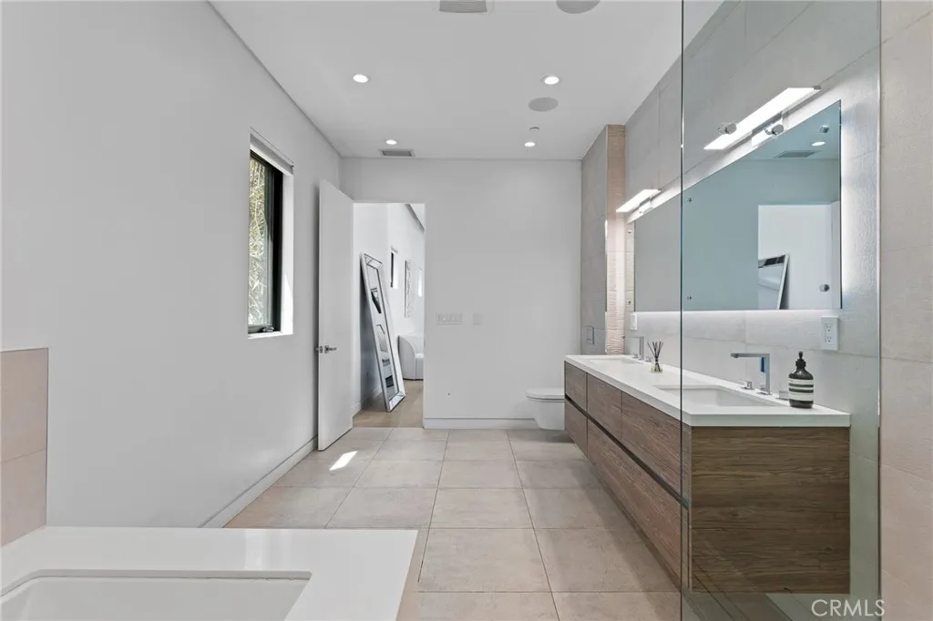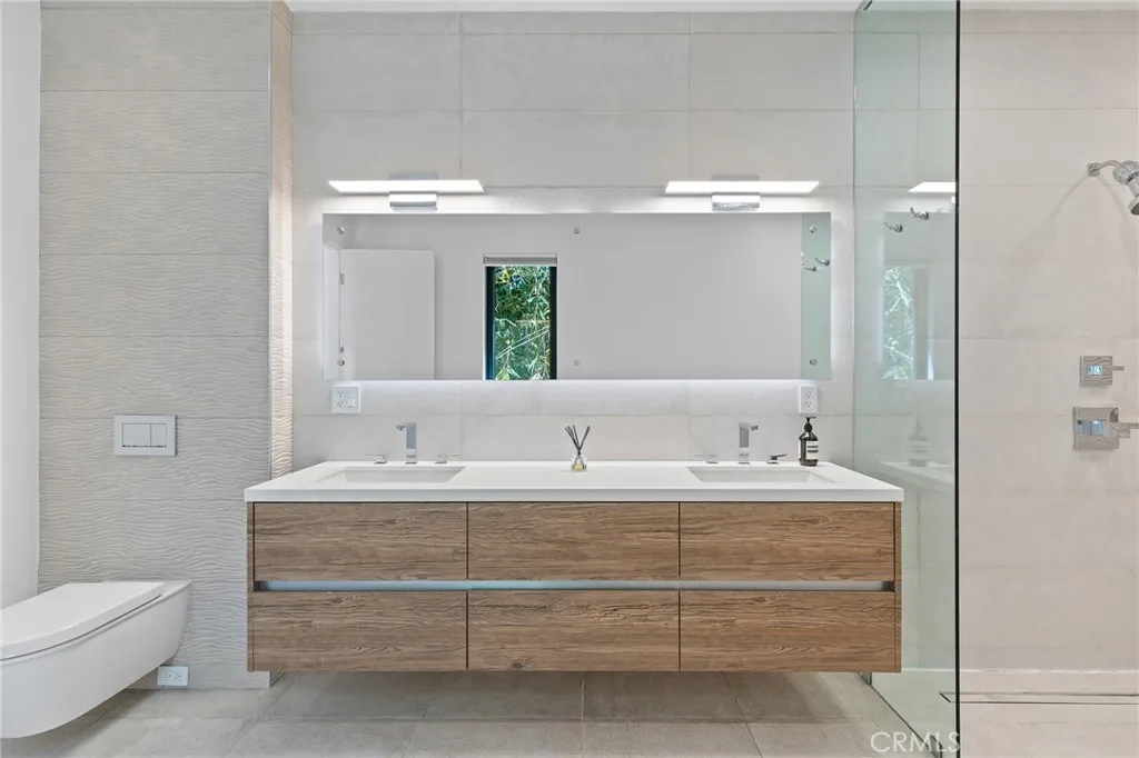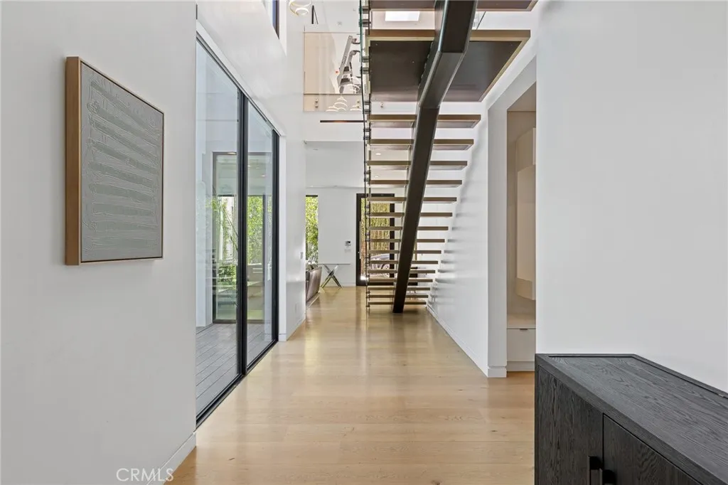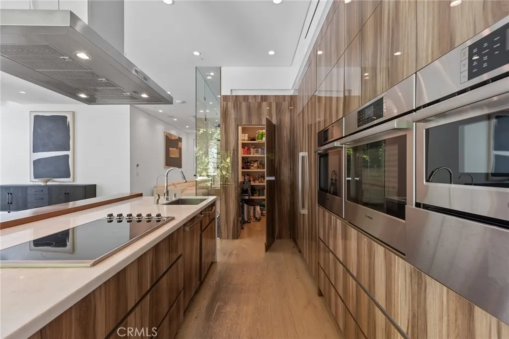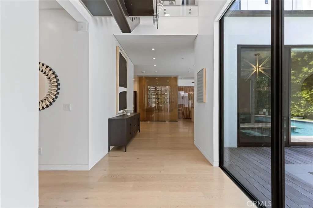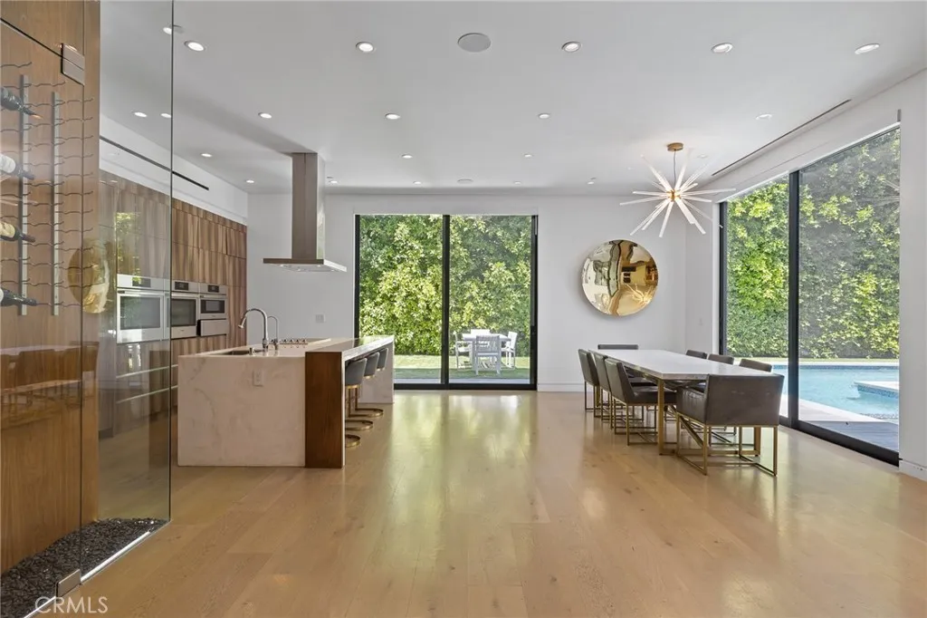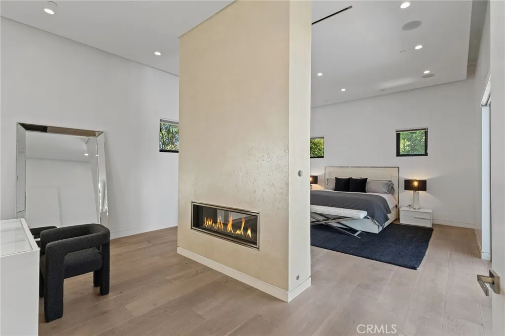 Gated and set behind a long private driveway, this custom contemporary estate offers exceptional privacy and refined modern living on one of the most desirable streets south of Ventura Boulevard. Surrounded by mature bamboo and ficus trees, the home provides a serene, resort-like setting just moments from Sherman Oaks best shopping and dining. Soaring ceilings and walls of glass fill the interiors with natural light, seamlessly connecting the open-concept living, dining, and chefs kitchen. The kitchen features premium Bosch and Viking appliances, custom cabinetry, a walk-in pantry, and a striking Calacatta marble island, complemented by a sleek glass-enclosed wine display and double-sided fireplace. Expansive sliding doors open to an entertainers backyard with a dramatic negative-edge pool, spa, and built-in BBQ, ideal for indoor-outdoor living. The main level includes a private bedroom suite perfect for guests or an office. Upstairs offers a family lounge, four en-suite bedrooms with walk-in closets, a spacious primary suite with fireplace and spa-style bath, and an upstairs laundry room. Built in 2018 with parking for 10+ cars, and just a short walk to Whole Foods, restaurants, the Sherman Oaks Galleria, and minutes to Buckley and Campbell Hall.