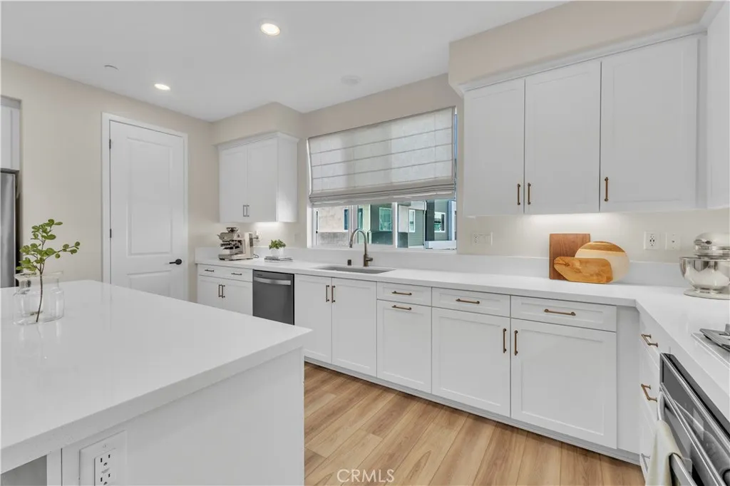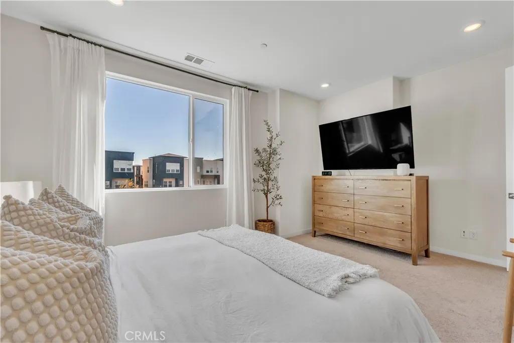 Experience exceptional modern living in the highly coveted FivePoint community of Valencia. Built in 2022, this tri-level townhome blends contemporary luxury with everyday comfort. Set in a prime location with inviting views, this light-filled 3 bedroom, 3.5 bathroom residence offers approximately 1,840 square feet of thoughtfully designed living space. The main level showcases an open-concept great room with living and dining areas that flow seamlessly into a sun-drenched kitchen. Enjoy a spacious center island, stainless steel Whirlpool appliances, walk-in pantry, Quartz countertops, and crisp white cabinetry. Wide-plank wood-like flooring and abundant natural light create a warm, tranquil atmosphere throughout. The upper level hosts the elegant primary suite, complete with plush carpeting, a generous walk-in closet, and a spa-inspired bathroom featuring dual vanities, a separate shower, and a soaking tub. An additional ensuite bedroom and a convenient laundry closet with side-by-side washer and dryer complete this floor. The lower level offers a charming entry and a versatile third bedroom, ideal as a family room, office, gym, or guest space and with sliding glass doors opening to the front courtyard. This level also includes a full bathroom with walk-in shower and direct access to the attached two-car garage. Designed for todays lifestyle, the home includes eco-friendly upgrades such as solar panels, an Ecobee thermostat, EV charger, water filtration system, and a tankless water heater, enhancing both convenience and sustainability. Residents of FivePoint enjoy an array