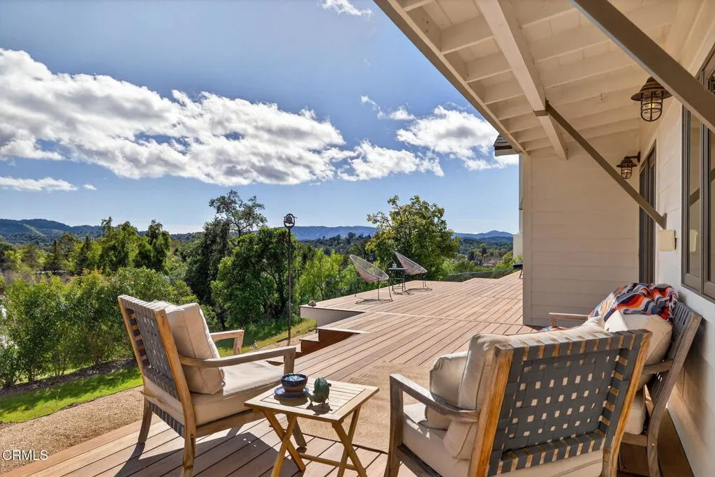 Beautifully updated and thoughtfully designed, this single-level home is set on approximately 2.5 acres in the Ojai Valley, offering panoramic west- and north-facing views along with exceptional privacy and tranquility.The residence features four bedrooms and three baths in a functional layout that separates the living areas from the bedroom wing. The living room is filled with natural light from large picture windows framing mountain views and includes a fireplace with an open connection to the formal dining room. The adjacent family room showcases vaulted wood ceilings, expansive windows, and its own fireplace, opening comfortably to the kitchen and breakfast area. A glass slider leads to a generous deck where sweeping south- and west-facing vistas unfold.The kitchen offers a welcoming workspace with newer appliances and a bay window above the sink that brings in abundant light and views. A pass-through between the kitchen and formal dining room functions like a butler's pantry--ideal for a bar, coffee station, or serving area. A spacious mudroom just beyond the kitchen connects to the garage and includes a laundry sink, additional refrigerator space, a three-quarter bath, and ample storage.Wood flooring flows throughout the home, enhancing continuity and complementing the updates completed by the current owners. All bedrooms are well proportioned, each featuring either large view windows or sliding doors to the deck. The primary suite is a true retreat with a sitting area and fireplace, plus two sliding doors--one opening to a private covered patio and the other to the e